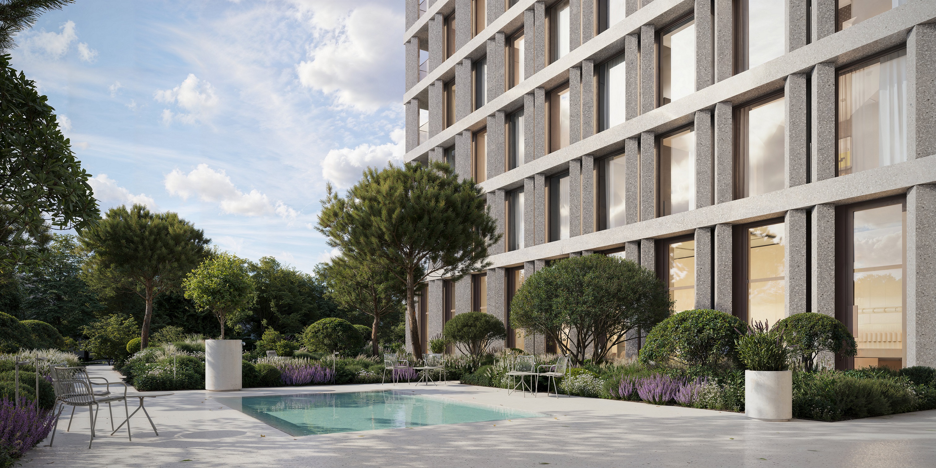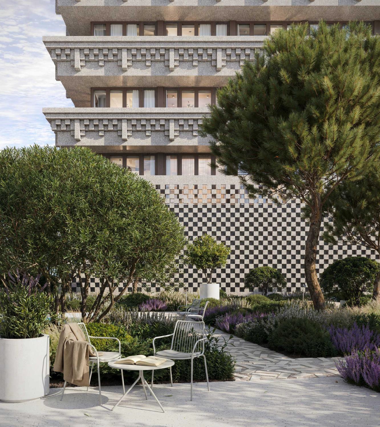 Концепция благоустройства продолжает архитектуру и усиливает ощущение приватности.