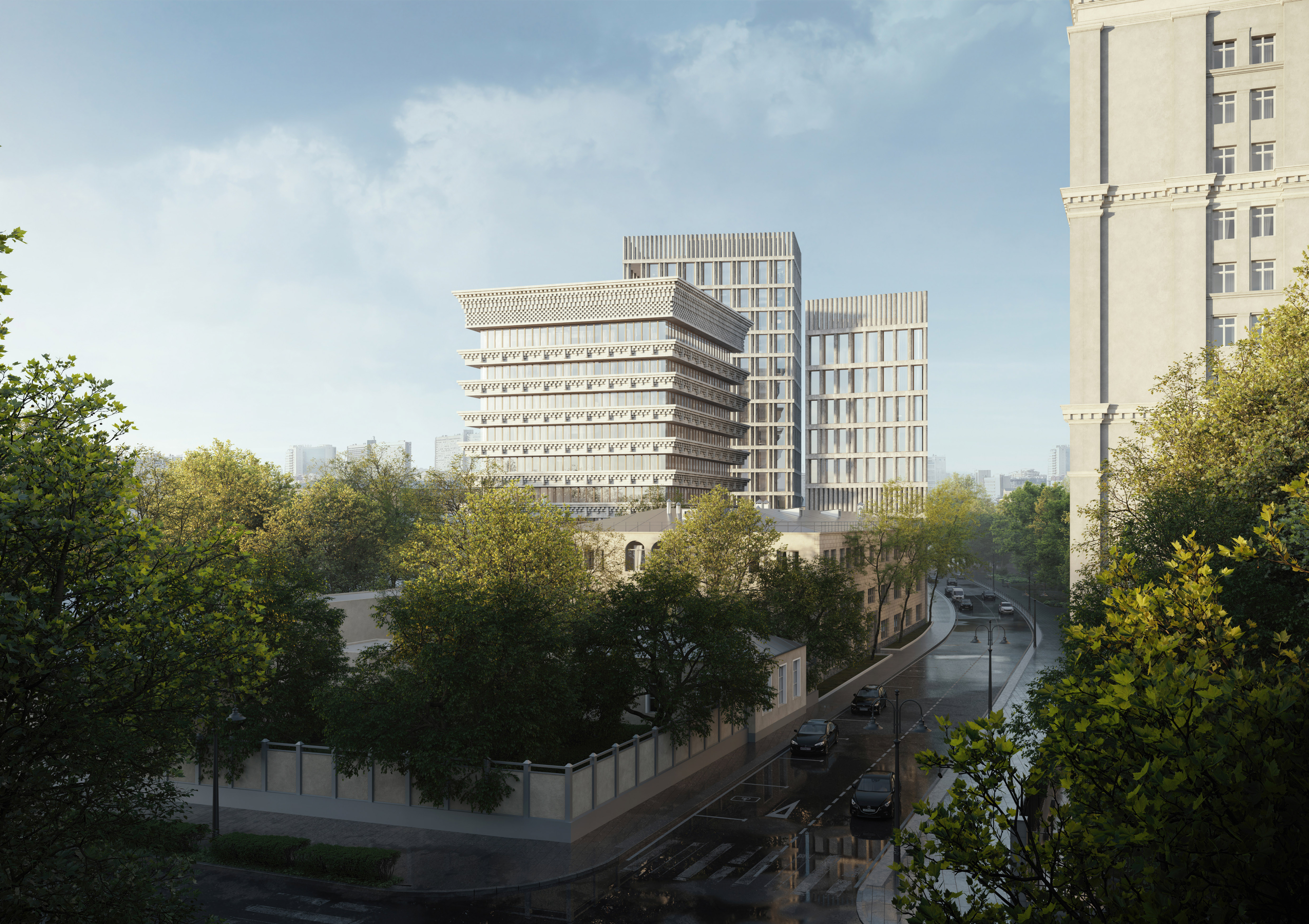 Строгий рисунок классического карниза, характерный для домов Большой Ордынки, переосмыслен в системе террас, которые по всему периметру опоясывают здание, формируя галерейные балконы.