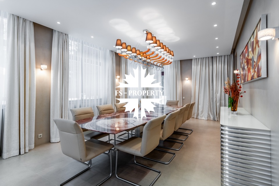 1-й этаж: прихожая с гардеробной, холл, кухня, столовая, гостиная со вторым светом, с/у, котельная, гараж на 2 м/м, комната для персонала с с/у и отдельным входом, постирочная.