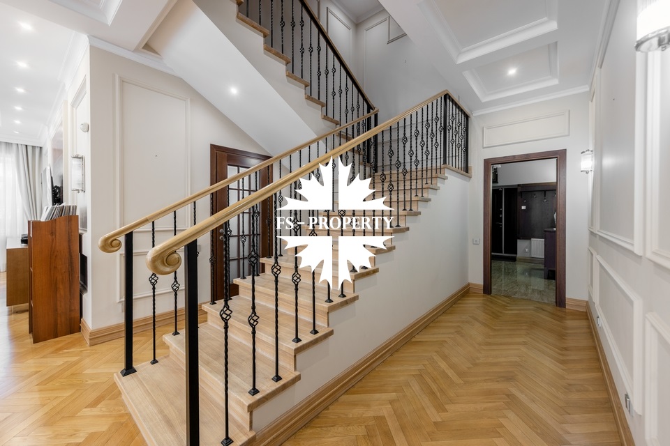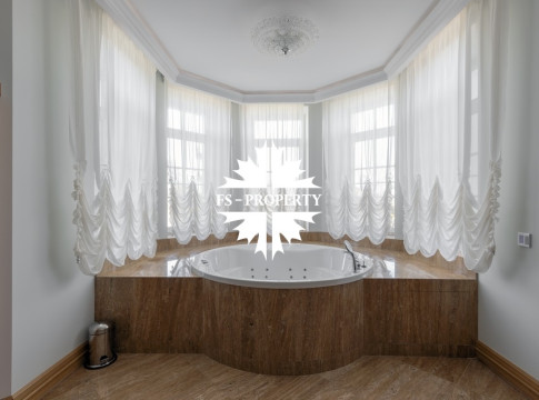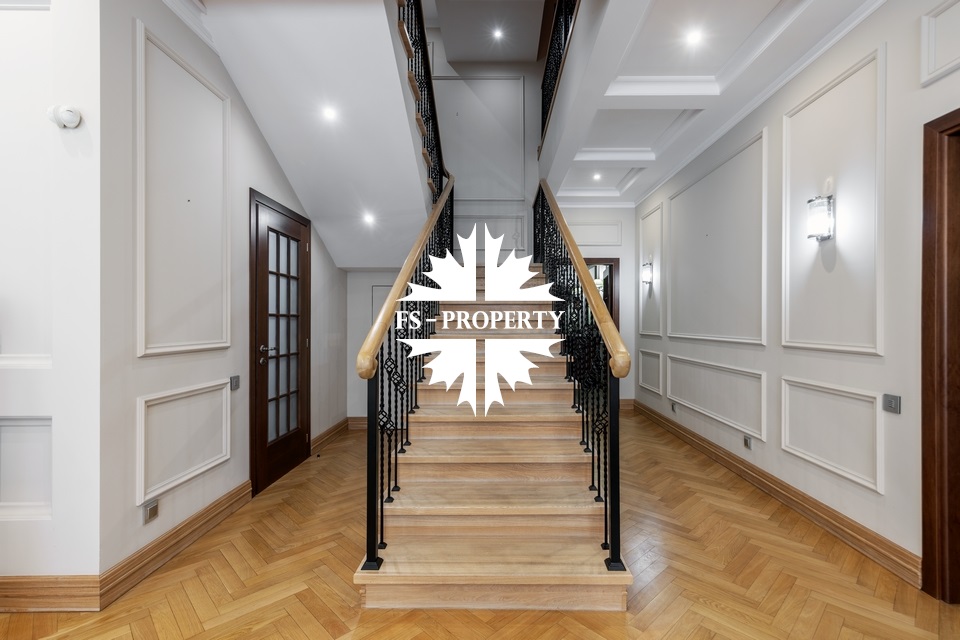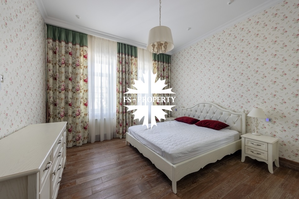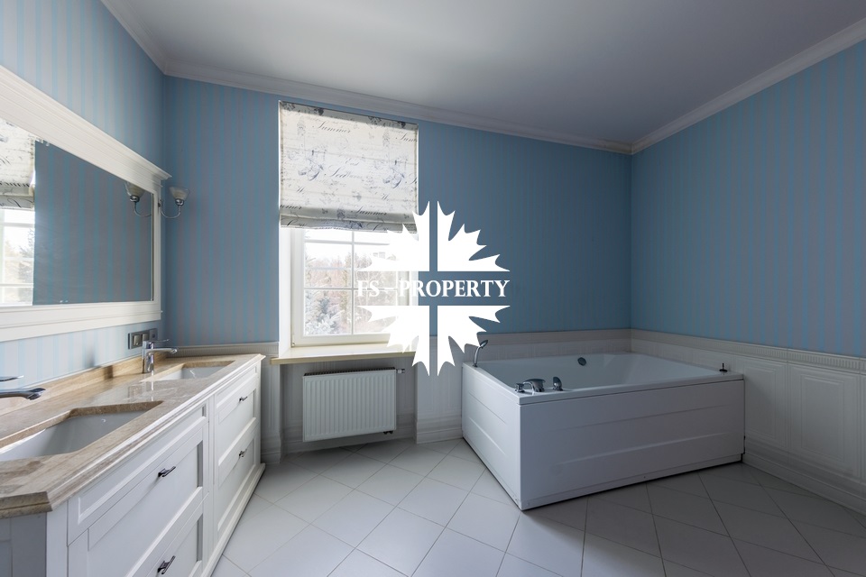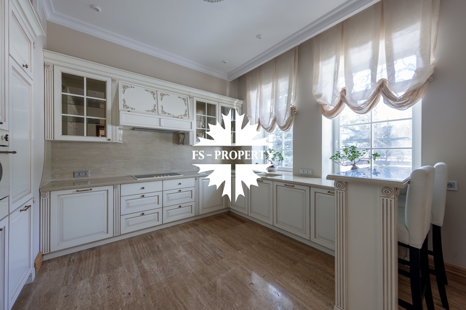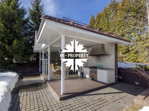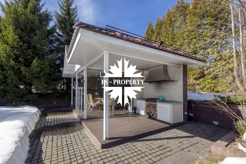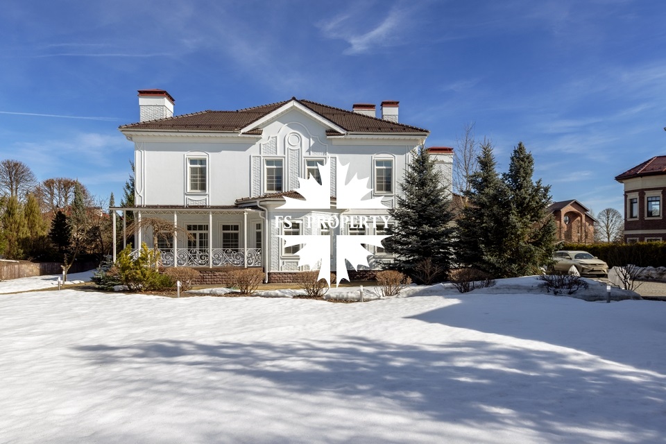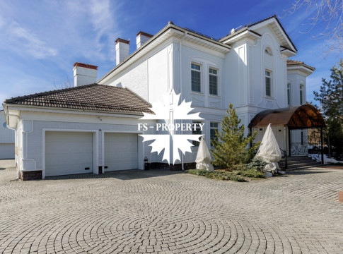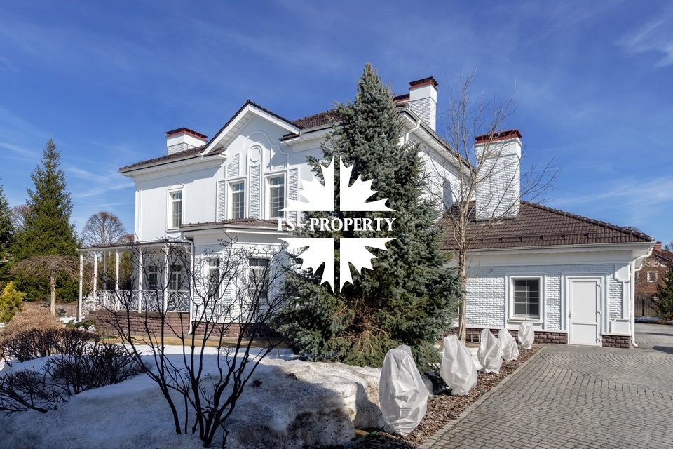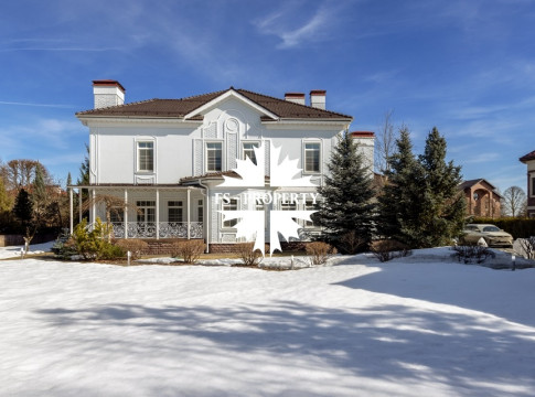 Загородный коттедж площадью 403 м² расположен на участке 24 сотки рядом с живописным лесом. Белоснежный фасад, выполненный в европейском стиле, облицован гладкой штукатуркой и благородным клинкерным кирпичом. Интерьеры выдержаны в светлых спокойных тонах — изящные молдинги, обои с нежным цветочным орнаментом и утончённые светильники наполняют пространство атмосферой уюта, а камин располагает к семейным вечерам. Дом полностью укомплектован комфортной мебелью и встроенной бытовой техникой. Система кондиционирования поддерживает приятный микроклимат в любое время года. Просторная гостиная, объединённая со столовой, кухня, четыре спальни, отдельный кабинет и игровая комната создают идеальную среду для жизни. Дополнительными преимуществами стали встроенный гараж на два автомобиля и квартира для персонала. На участке выполнен ландшафтный дизайн с аккуратным газоном, мощёными дорожками, уличными фонарями, декоративными кустарниками и пушистыми елями. Для отдыха на свежем воздухе построили застеклённую беседку, где можно собираться за чаепитием в кругу близких, а также здесь обустроили мангальную зону для тёплых встреч с друзьями.