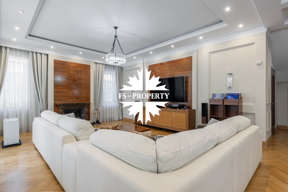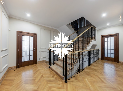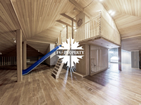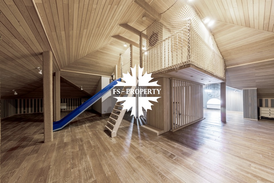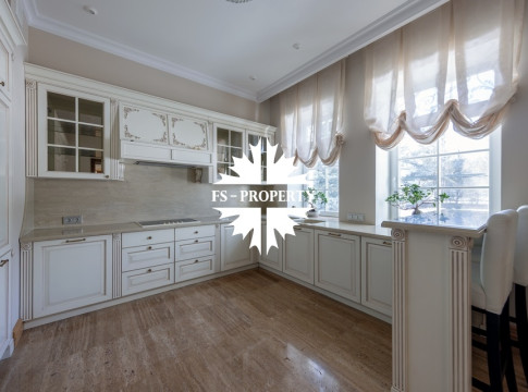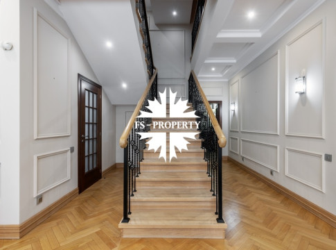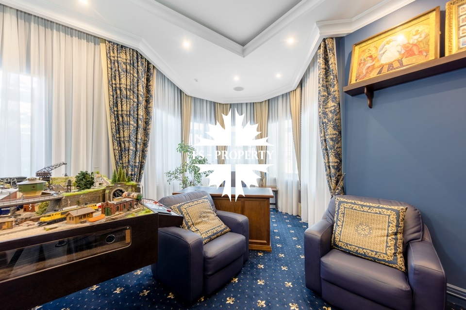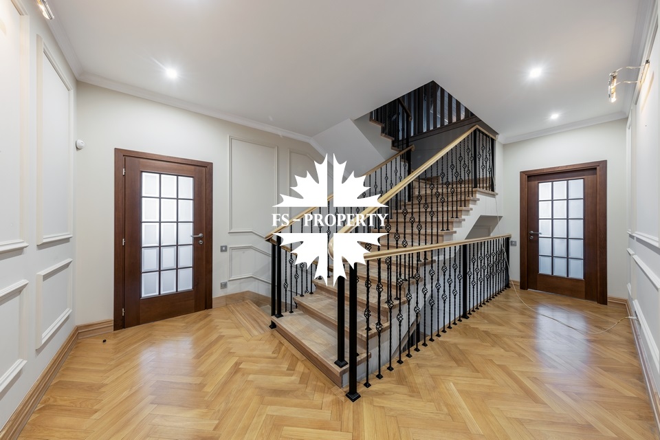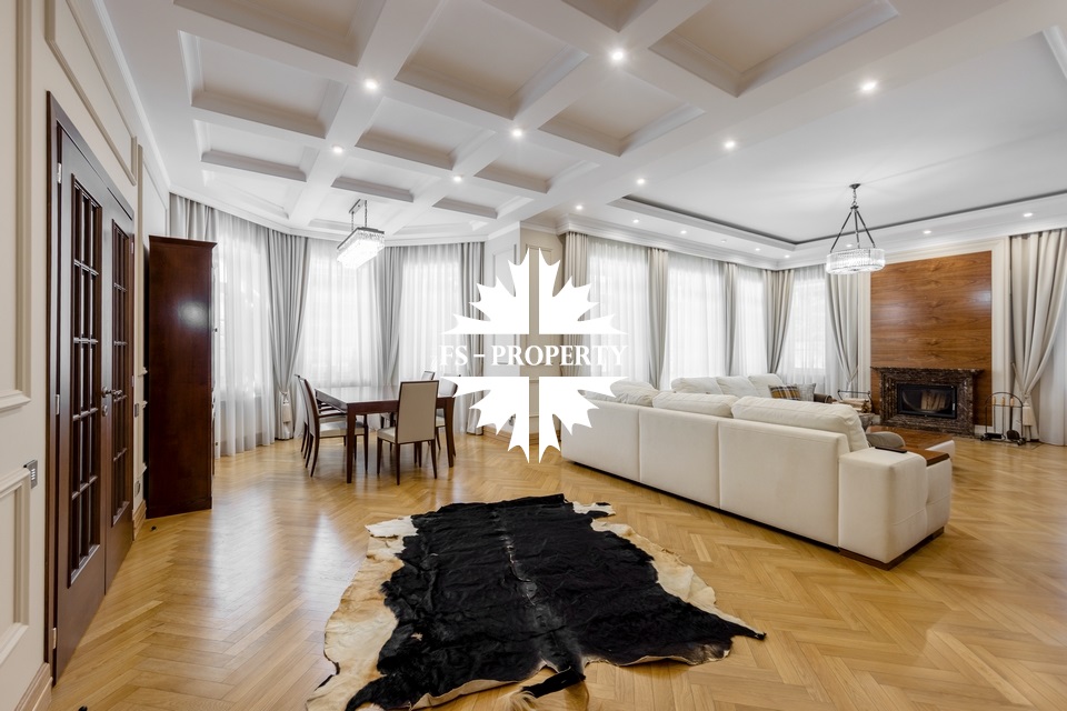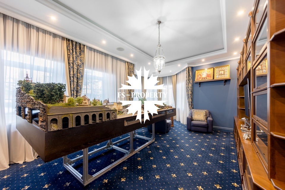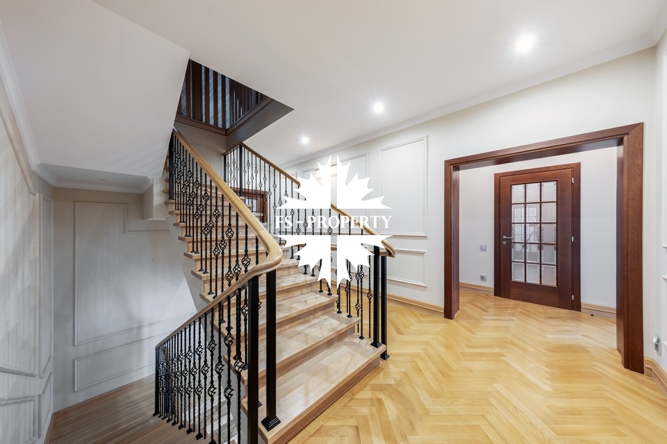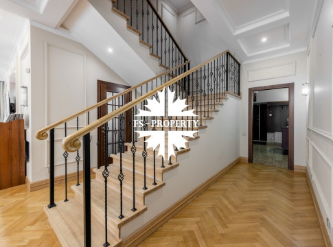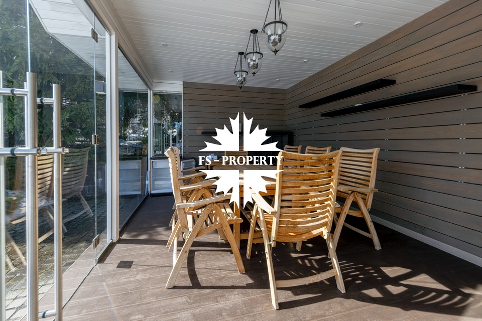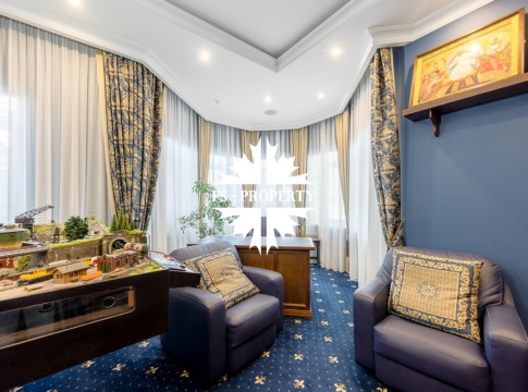 Загородный коттедж площадью 403 м² расположен на участке 24 сотки рядом с живописным лесом. Белоснежный фасад, выполненный в европейском стиле, облицован гладкой штукатуркой и благородным клинкерным кирпичом. Интерьеры выдержаны в светлых спокойных тонах — изящные молдинги, обои с нежным цветочным орнаментом и утончённые светильники наполняют пространство атмосферой уюта, а камин располагает к семейным вечерам. Дом полностью укомплектован комфортной мебелью и встроенной бытовой техникой. Система кондиционирования поддерживает приятный микроклимат в любое время года. Просторная гостиная, объединённая со столовой, кухня, четыре спальни, отдельный кабинет и игровая комната создают идеальную среду для жизни. Дополнительными преимуществами стали встроенный гараж на два автомобиля и квартира для персонала. На участке выполнен ландшафтный дизайн с аккуратным газоном, мощёными дорожками, уличными фонарями, декоративными кустарниками и пушистыми елями. Для отдыха на свежем воздухе построили застеклённую беседку, где можно собираться за чаепитием в кругу близких, а также здесь обустроили мангальную зону для тёплых встреч с друзьями.