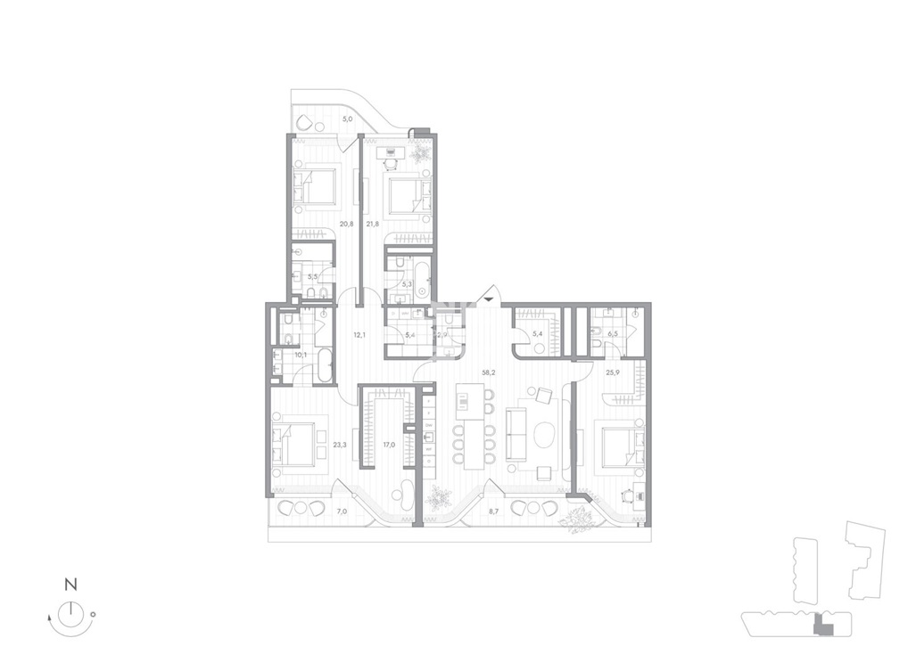 Планировкой предусмотрено: просторная кухня-гостиная, мастер-спальня, з отдельные спальни, 5 санузлов, гардеробные, кабинет и дополнительные зоны хранения.