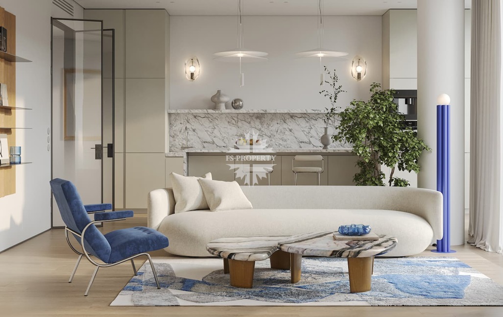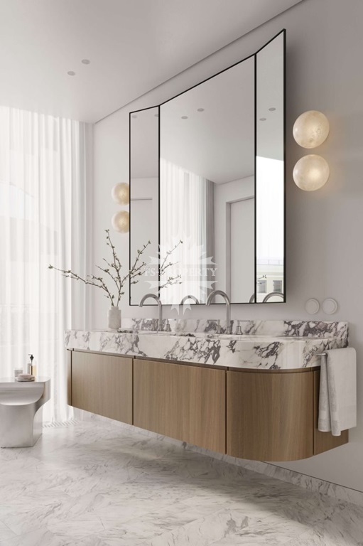 Квартира предлагается к продаже с премиальной отделкой и полностью оборудованными санузлами и кухней. В отделке использованы натуральное дерево и камень.