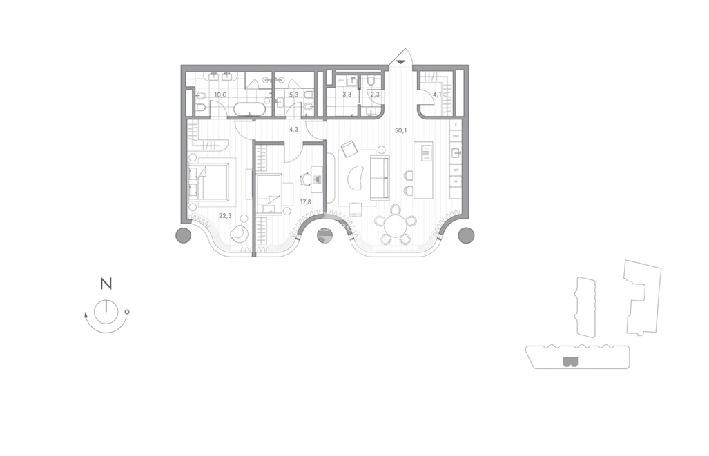 Планировкой предусмотрено: просторная кухня-гостиная, 2 спальни, 3 санузла, гардеробная.