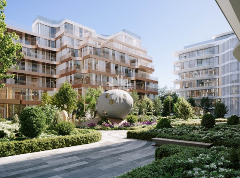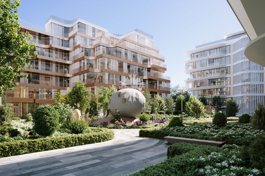 Закрытый внутренний двор — это ландшафтный парк с зонами отдыха, водными объектами и детской площадкой. Здесь природа органично вплетена в городскую среду.