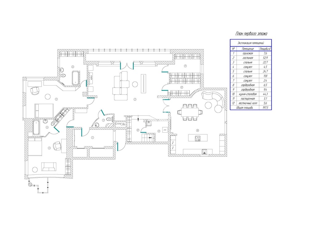 1 уровень – 200 кв.м., спланированы просторная зона кухни – столовой, гостиная с дровяным камином, панорамными окнами и выходом на балкон, две спальни с ванными комнатами, две гардеробные, гостевой санузел, хозяйственная комната.