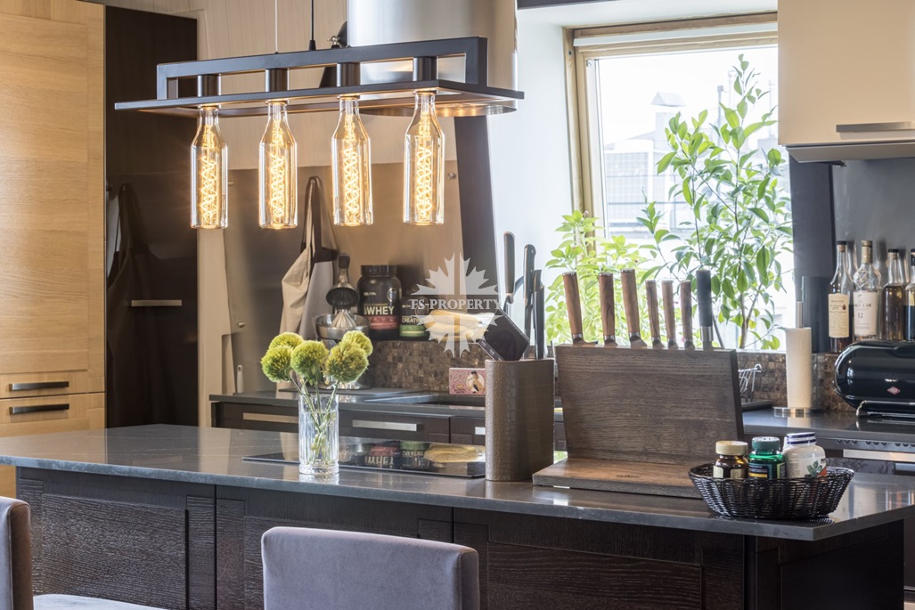 В квартире выполнена отделка в современном стиле, с использованием натуральных отделочных материалов.