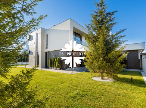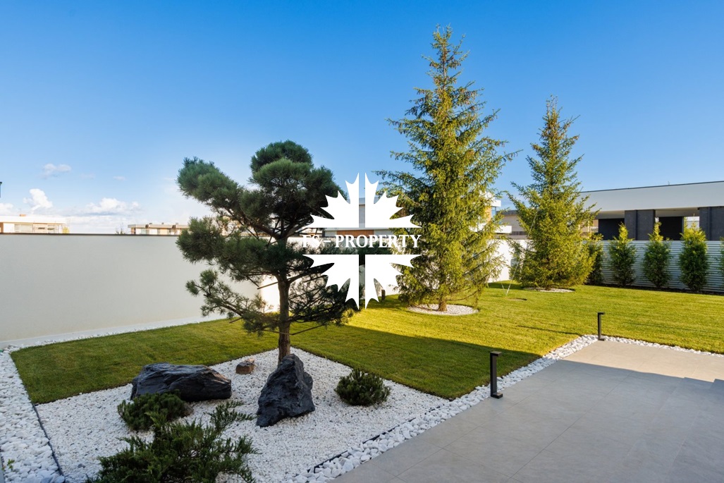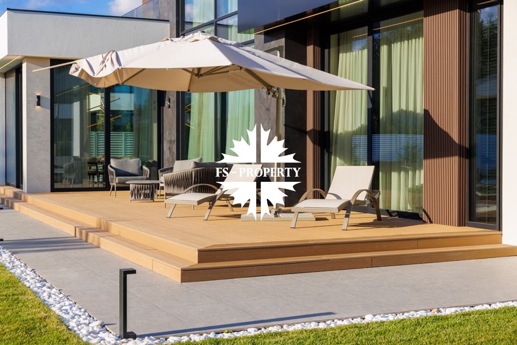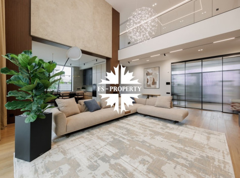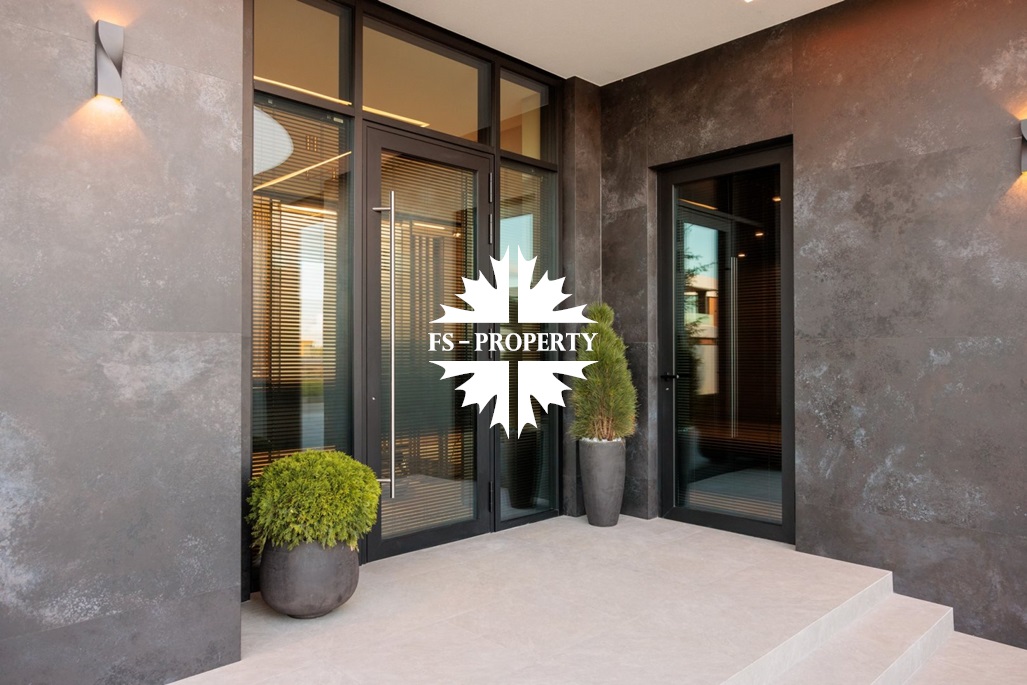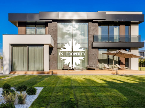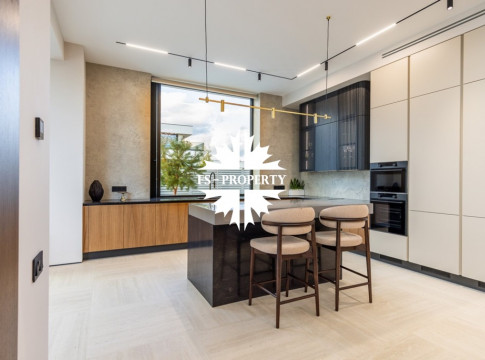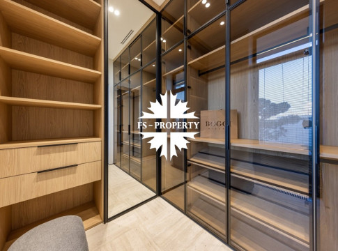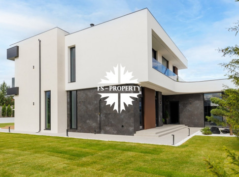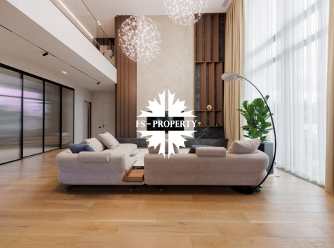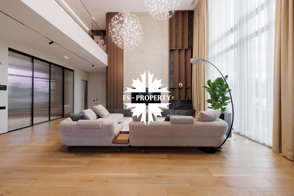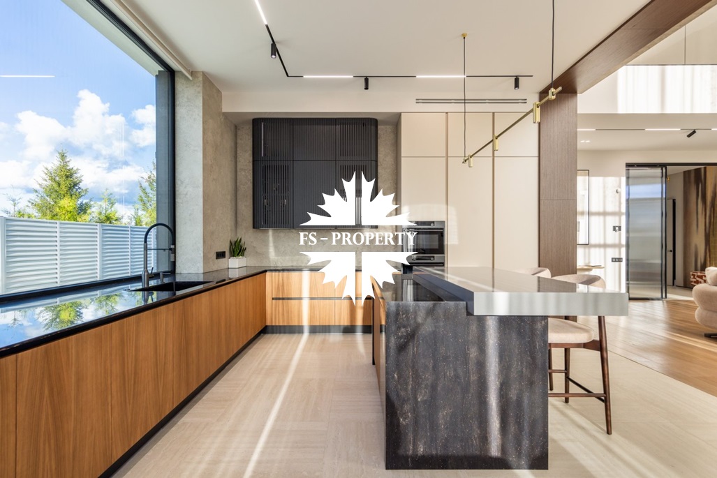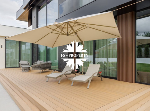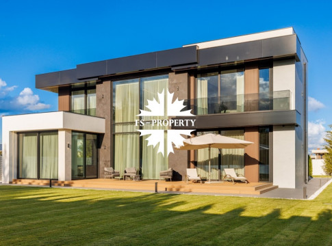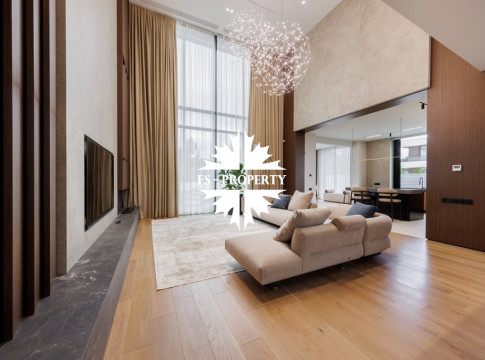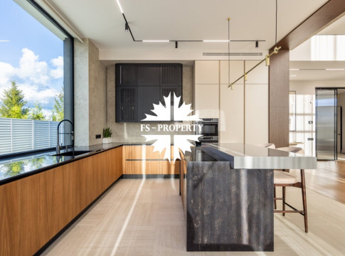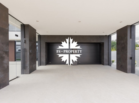 1 этаж (285м): гардероб при входе, кухня, просторная гостиная со вторым светом, столовая с панорамным остеклением, гостевая спальня с собственным санузлом и гардеробной, бойлерная с отдельным входом для обслуживания, гараж и навес на 2 автомобиля, просторная открытая терраса;