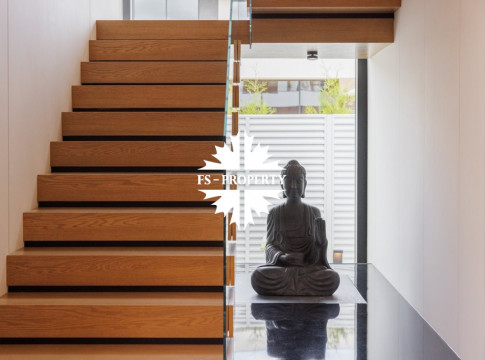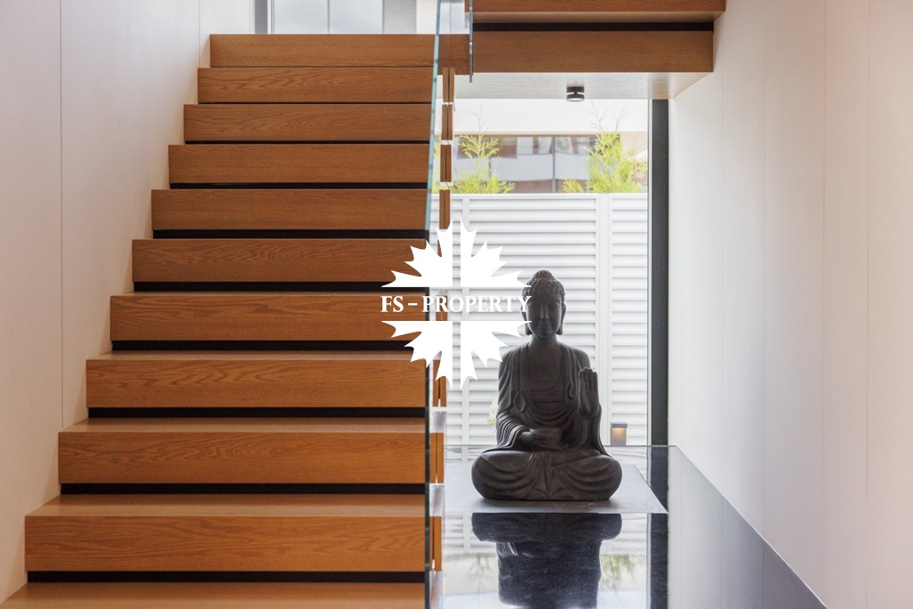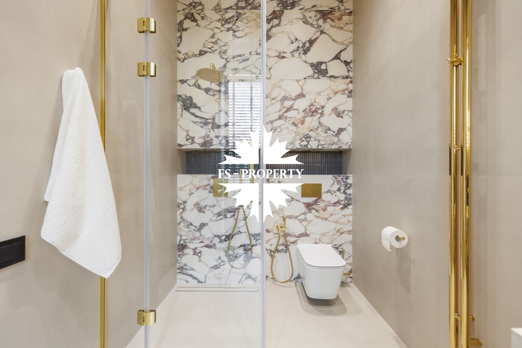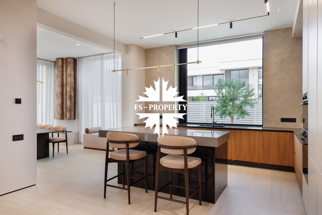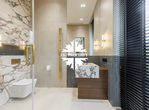 Интерьер дома выдержан в пастельных тонах. Использованы премиальные материалы: итальянская плитка Italon, Laminam, Imola Infinity Brazil, Ariostea Marm, Mirage ginger и другие; паркет из дубовой доски, итальянский текстиль. Мебель итальянских производителей, бытовая техника Asko, сантехника Ramon Soler Испания, ванны итальянского бренда Salini.