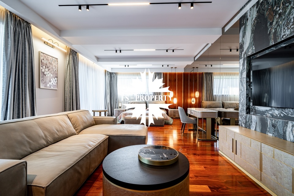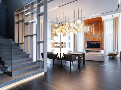 Интерьер создан студией Prosvirin Design и сочетает натуральные материалы и высокие технологии. В отделке использованы кварцит, редкие породы дерева, итальянская сантехника CEA и Antonio Lupi, свет от Центрсвет и ведущих итальянских брендов. Кухня оснащена техникой Bosch, холодильниками Liebherr, а каждая спальня — телевизорами Samsung. Мебель итальянских и португальских брендов Henge и Frato формирует атмосферу современного уюта и элегантной роскоши.