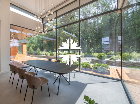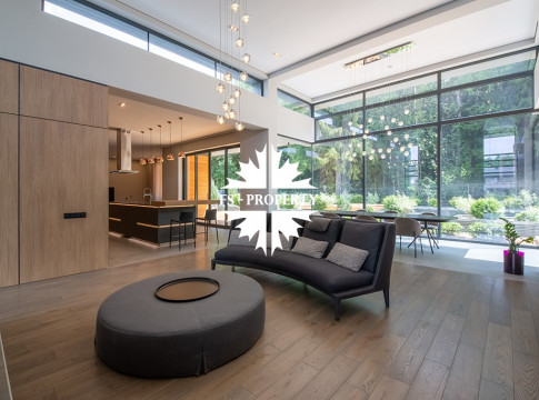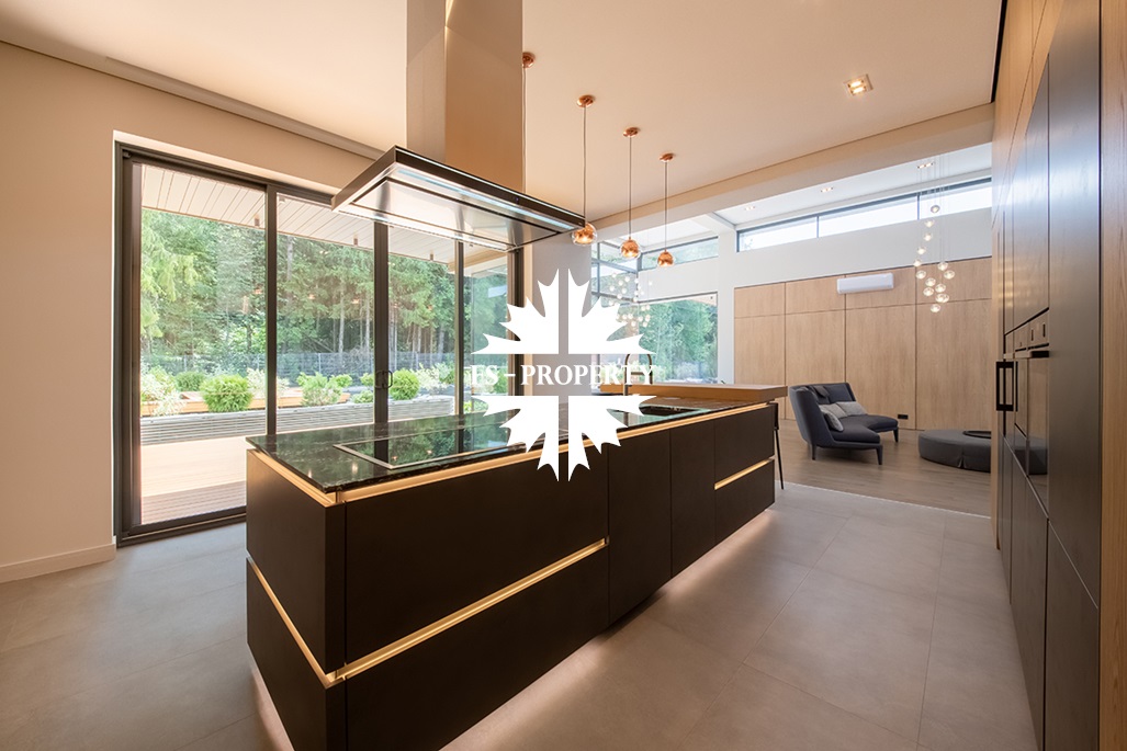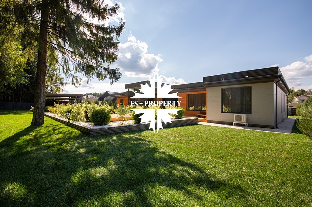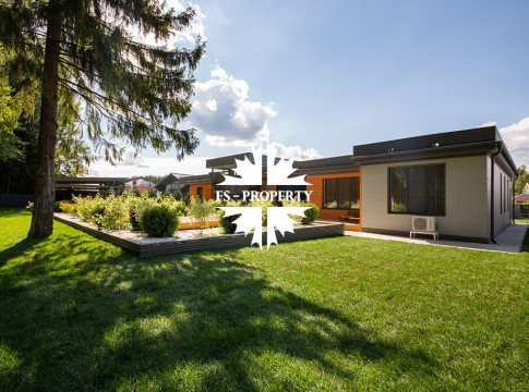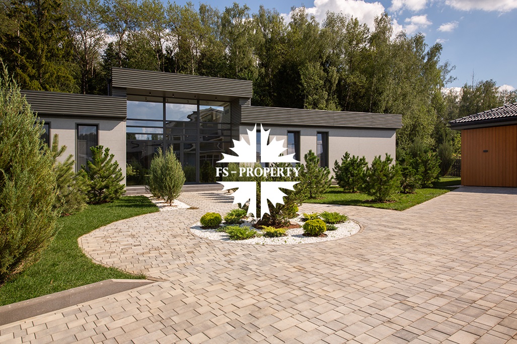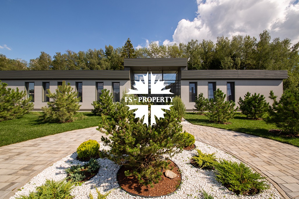 На продажу предлагается новый одноэтажный дом в КП «Природный парк Каменка» общей площадью 420 кв. м на ландшафтном участке 25 соток. Дом построен по индивидуальному проекту. К материалам строительства были применены газобетонные блоки. Облицовка фасада выполнена из японских вентилируемых фасадов и лиственницы. Панорамное остекление, практически все окна в доме с видом на лес.
