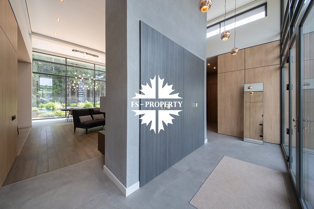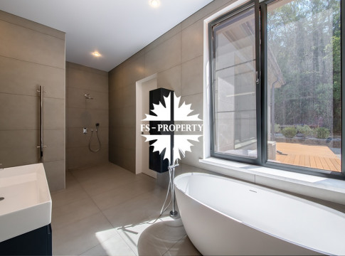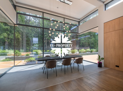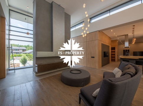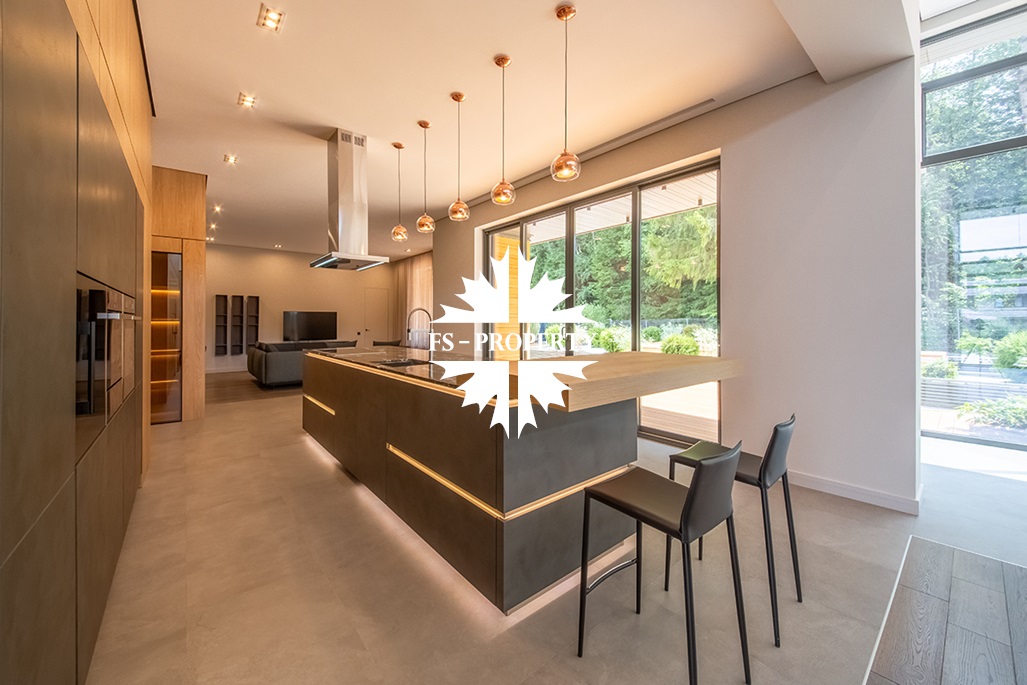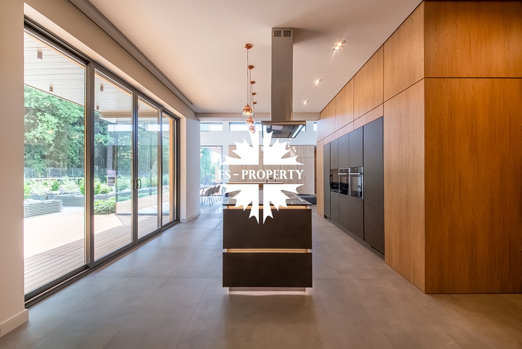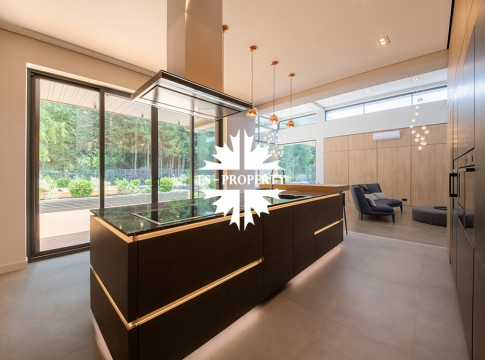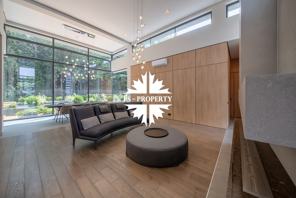 На продажу предлагается новый одноэтажный дом в КП «Природный парк Каменка» общей площадью 420 кв. м на ландшафтном участке 25 соток. Дом построен по индивидуальному проекту. К материалам строительства были применены газобетонные блоки. Облицовка фасада выполнена из японских вентилируемых фасадов и лиственницы. Панорамное остекление, практически все окна в доме с видом на лес.