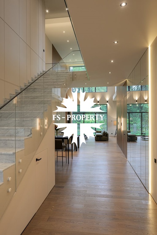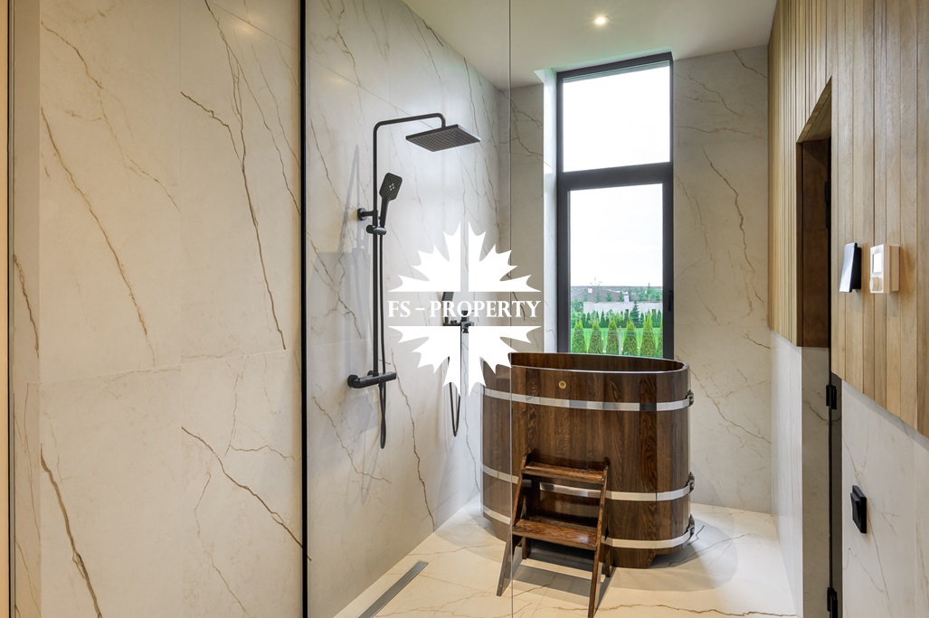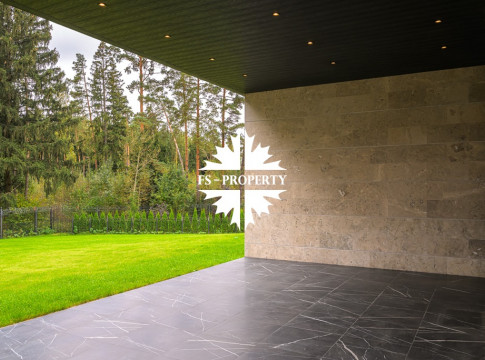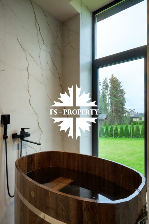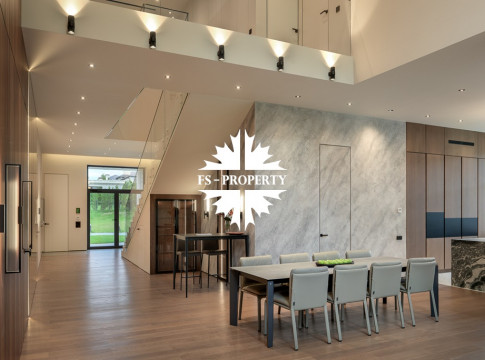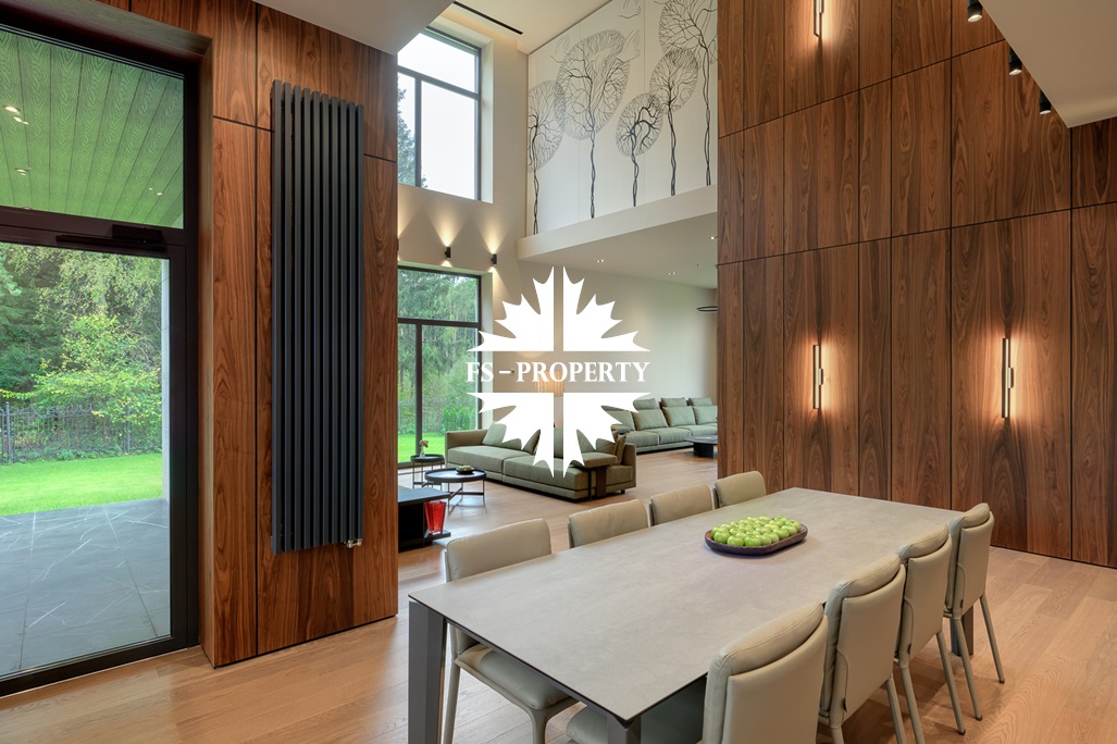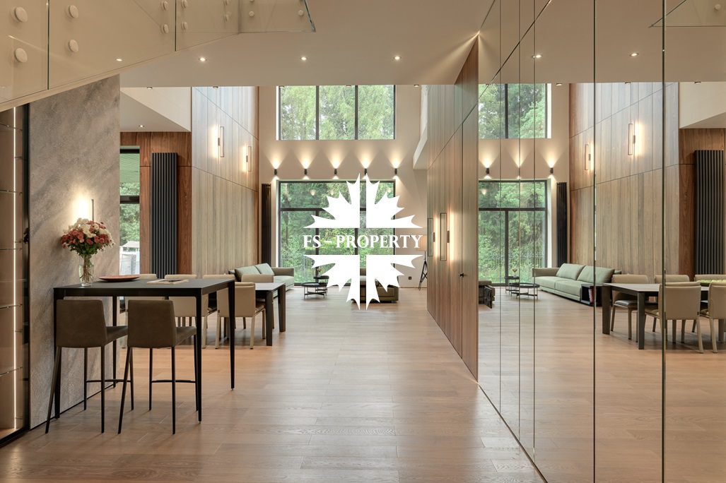 Общественная зона: Полностью укомплектованная мебелью гостиная-столовая-кухня - единое пространство со вторым светом, общей площадью 115 м2 и объемом - 570 м3 (выделено 5 функциональных зон: медиа зона с ТВ и дровяным камином, лаунж зона с двумя большими диванами, столовая со столом на 8 персон (с возможностью увеличения до 20), зона бара с двумя сервантами и барной стойкой, парадная кухня с островом 20 м2 (с доступом в рабочую кухню 12 м2)). Окна этого пространства смотрят на восток, юг и запад. Блок свободного назначения с санузлом и сауной (общая площадь блока 37 м2. Комната может использоваться как игровая, СПА, спортзал, кинотеатр, бильярдная и т.д.). Крытая терраса с видом на лес с доступом из кухни и столовой. Хозяйский санузел первого этажа, оснащенный умывальником, унитазом, биде и писсуаром.