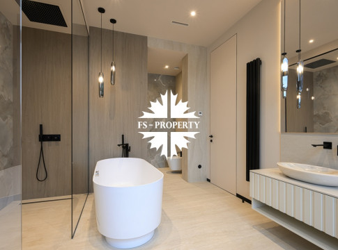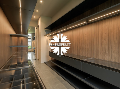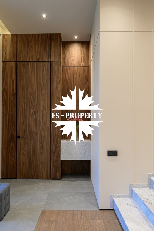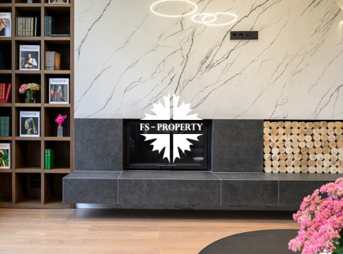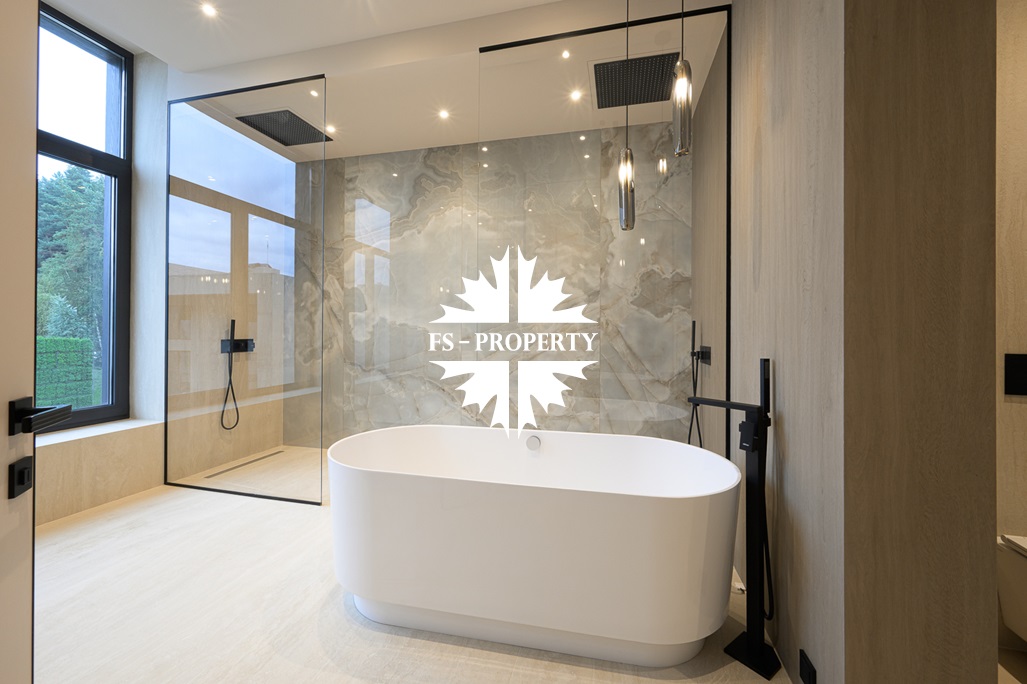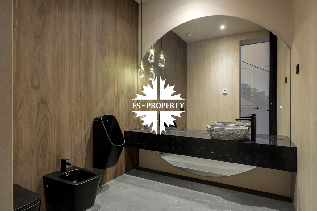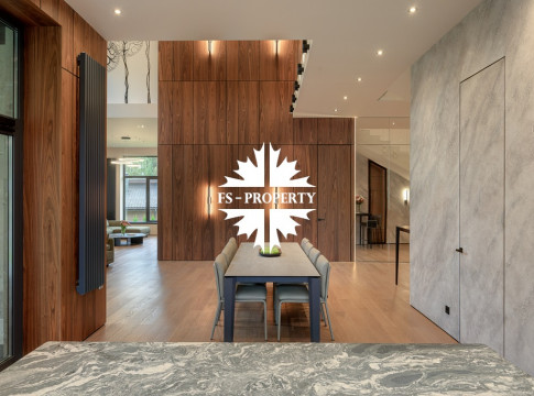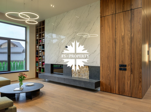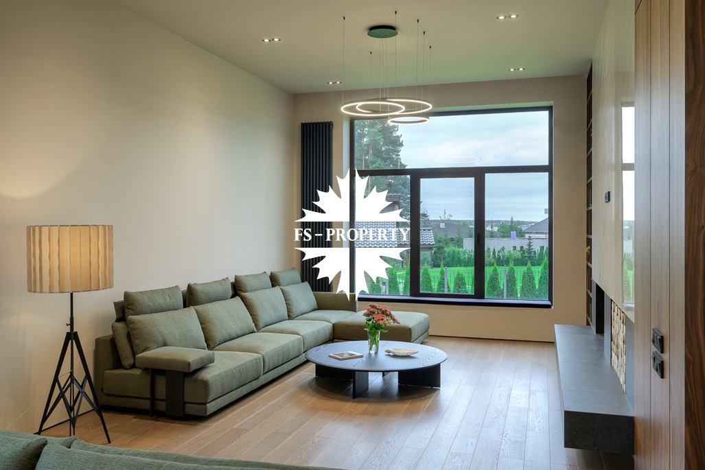 Общественная зона: Полностью укомплектованная мебелью гостиная-столовая-кухня - единое пространство со вторым светом, общей площадью 115 м2 и объемом - 570 м3 (выделено 5 функциональных зон: медиа зона с ТВ и дровяным камином, лаунж зона с двумя большими диванами, столовая со столом на 8 персон (с возможностью увеличения до 20), зона бара с двумя сервантами и барной стойкой, парадная кухня с островом 20 м2 (с доступом в рабочую кухню 12 м2)). Окна этого пространства смотрят на восток, юг и запад. Блок свободного назначения с санузлом и сауной (общая площадь блока 37 м2. Комната может использоваться как игровая, СПА, спортзал, кинотеатр, бильярдная и т.д.). Крытая терраса с видом на лес с доступом из кухни и столовой. Хозяйский санузел первого этажа, оснащенный умывальником, унитазом, биде и писсуаром.