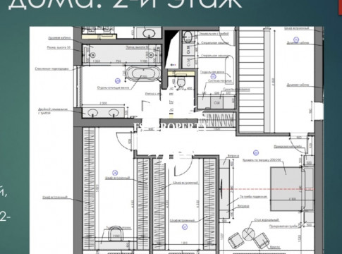 В доме возможно разместить до 7 спален, парадный холл 16 кв. м., гардеробная 16 кв. м., два кабинета 16 и 20 кв. м (с возможностью обустройства спальни или гардеробной), гостевой санузел с душевой кабиной, гостиная-столовая-кухня — единое пространство со вторым светом 106 кв. м. и кубатурой 540 кв. м. Окна ориентированы на три стороны: юго-восток, юго-запад и северо-запад.