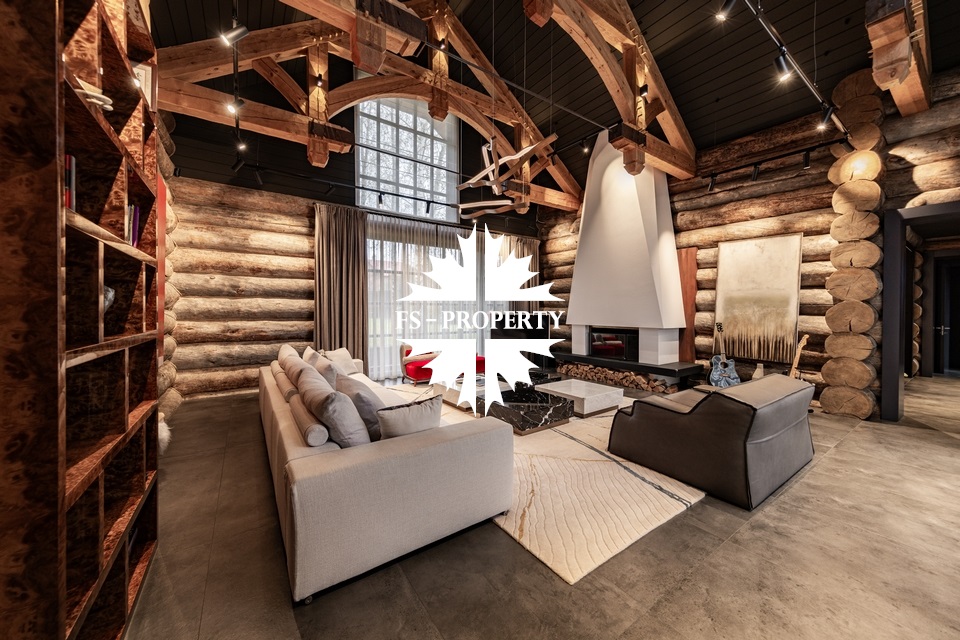 Дом выполнен в стиле гибридный канадский деревянный дом – Шале. Главное преимущество участка и дома – уникальность строения и материала, дом построен из сухостойного бревна Kelo диаметрами до 80 см и не имеет аналогов в своем роде. Крыша выполнена из красноярской лиственницы. Весь материал для строительства дома был привезен из Карелии.