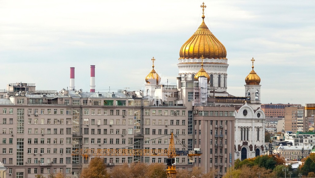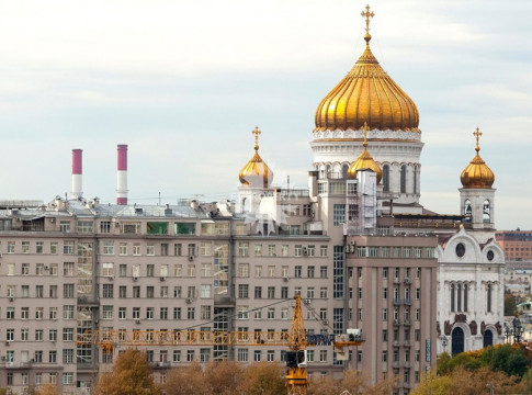 Красивый вид из окон на Храм Христа Спасителя, Колокольню и Храм Софии Премудрости Божией, Кремлевские башни, Сити.