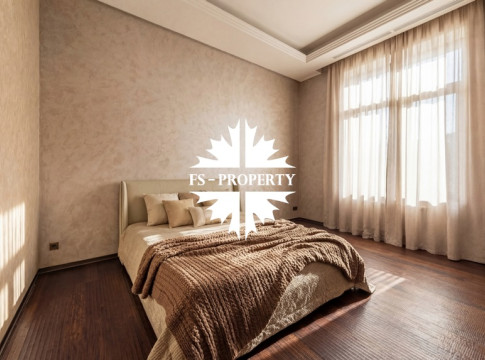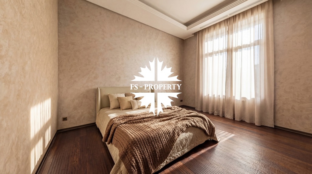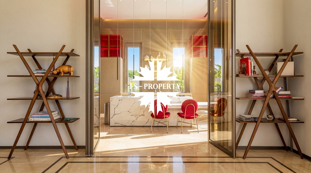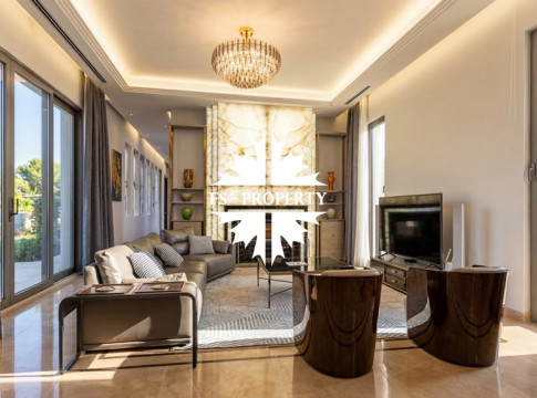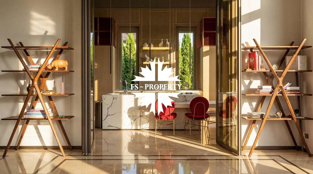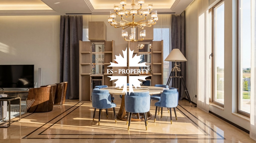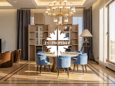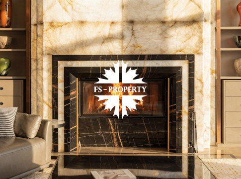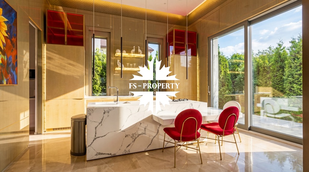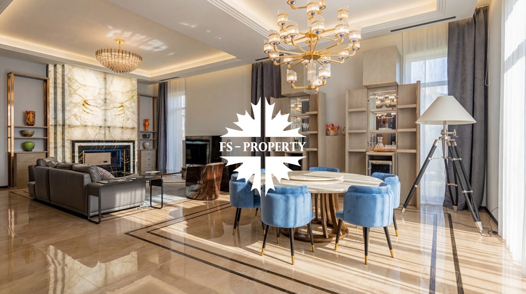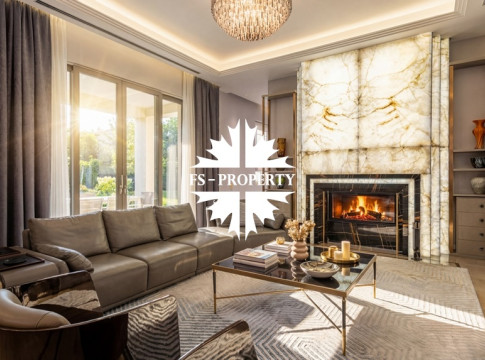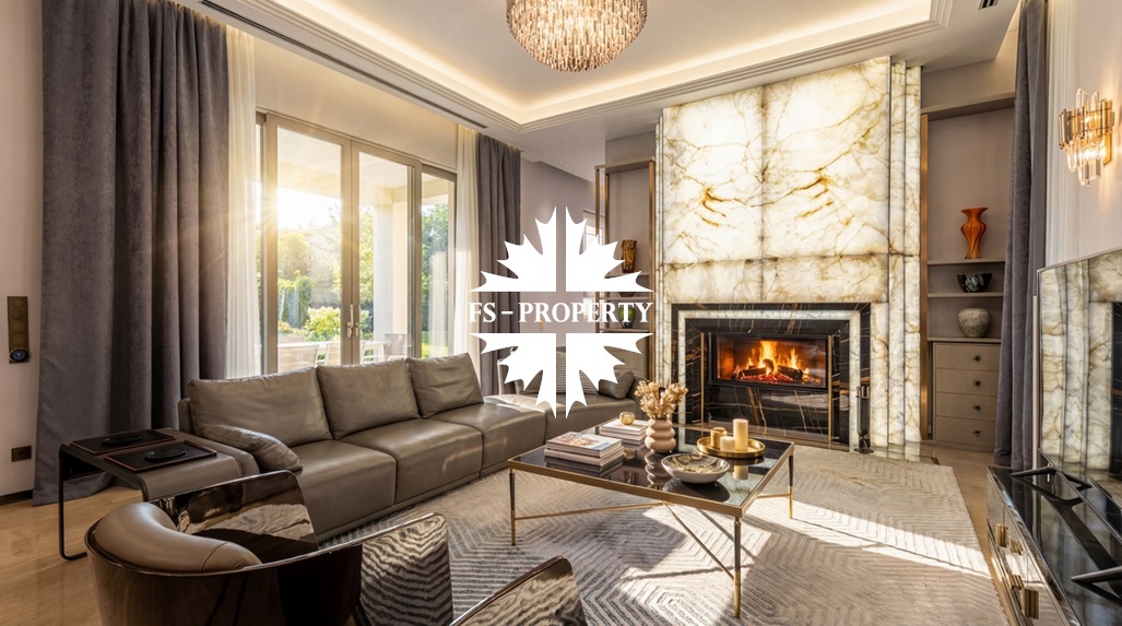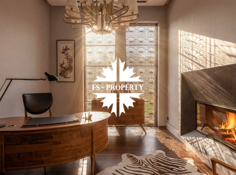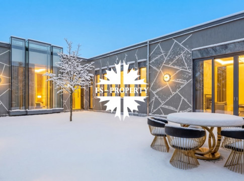 Центром притяжения становится уютная гостиная с уникальным камином, отделанным подсвеченным ониксом. Пространство органично включает современную кухню с собственной кладовой и выходом на террасу, кабинет для уединённой работы, три спальни и три санузла. Практичность обеспечена просторной гардеробной при входе, постирочной и гаражом на три автомобиля