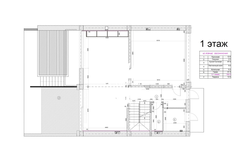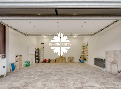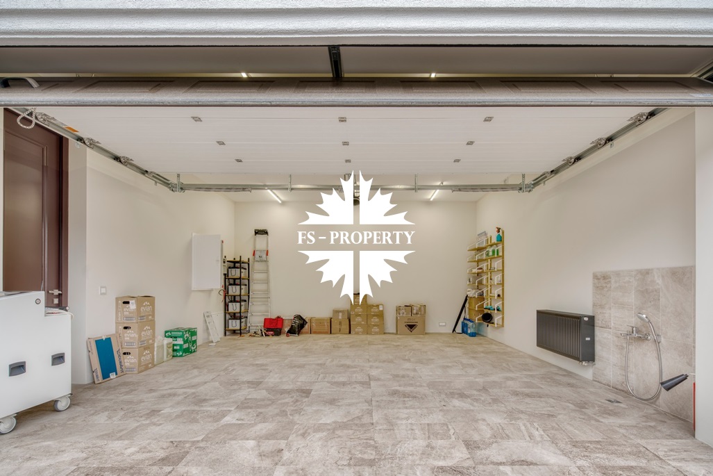 Первый этаж: гараж на две машины, котельная, санузел с душем, кухня-гостиная с камином и выходом в сад.