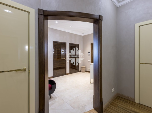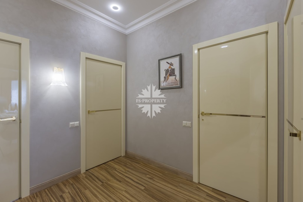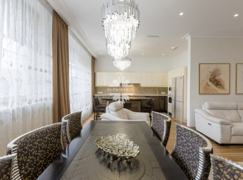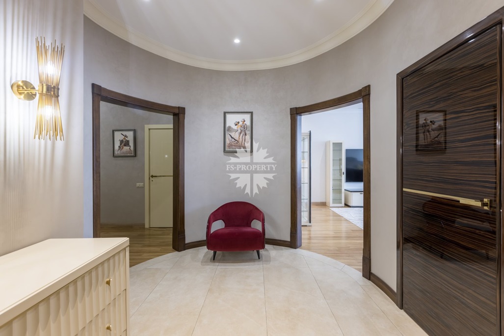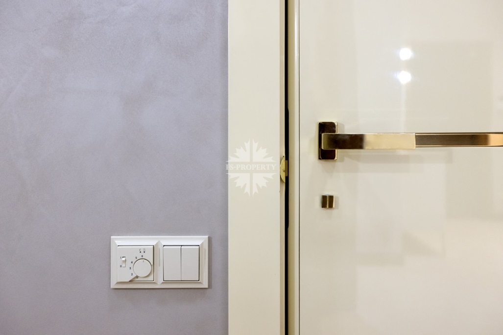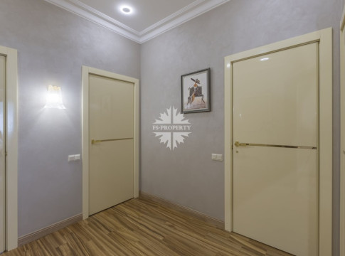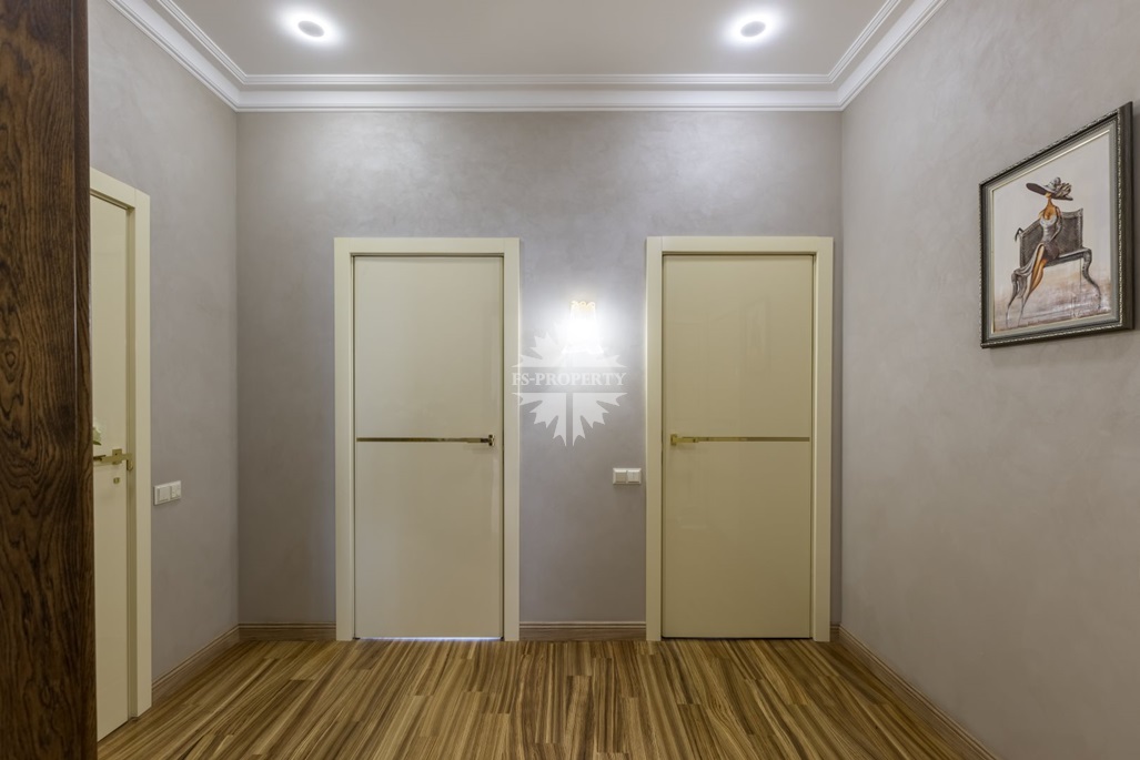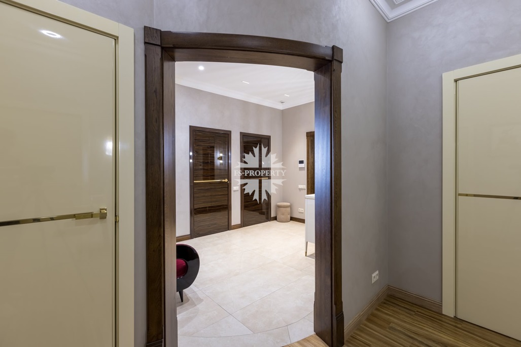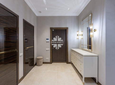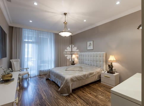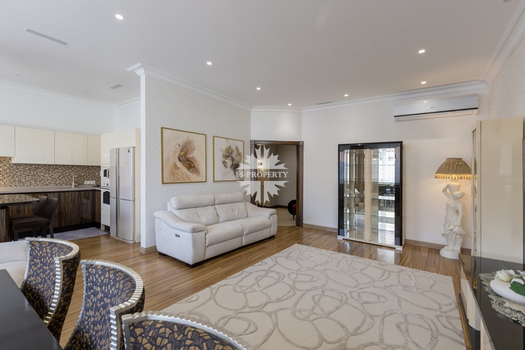 Квартира укомплектована мебелью и бытовой техникой известных мировых производителей. В отделке использованы высококачественные материалы: дуб, мрамор, травертин.