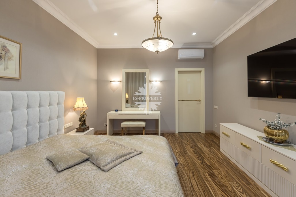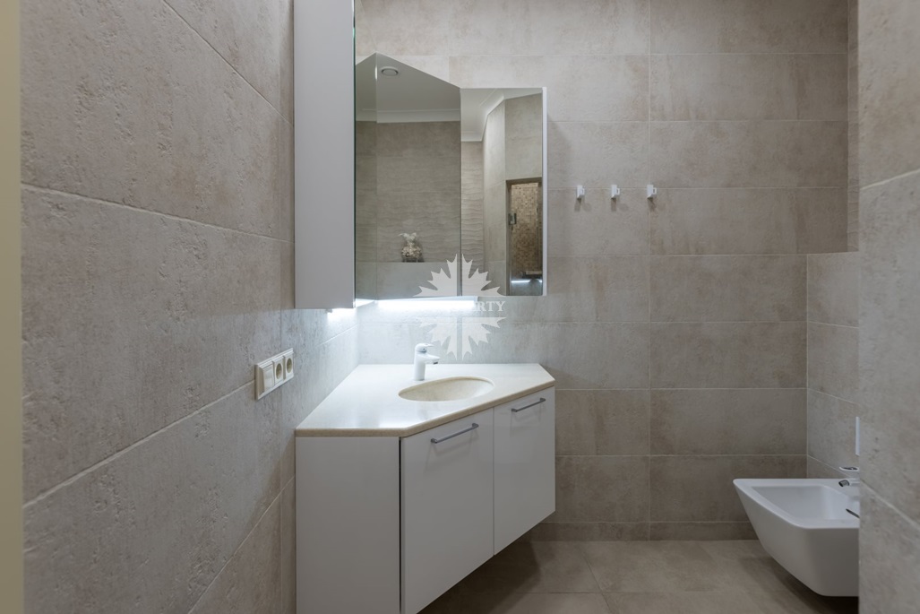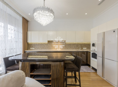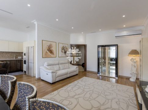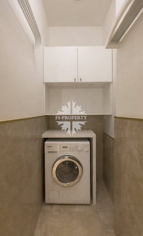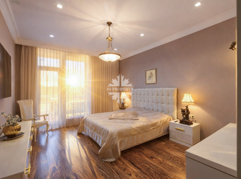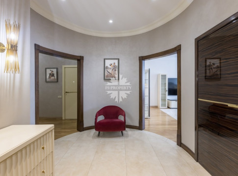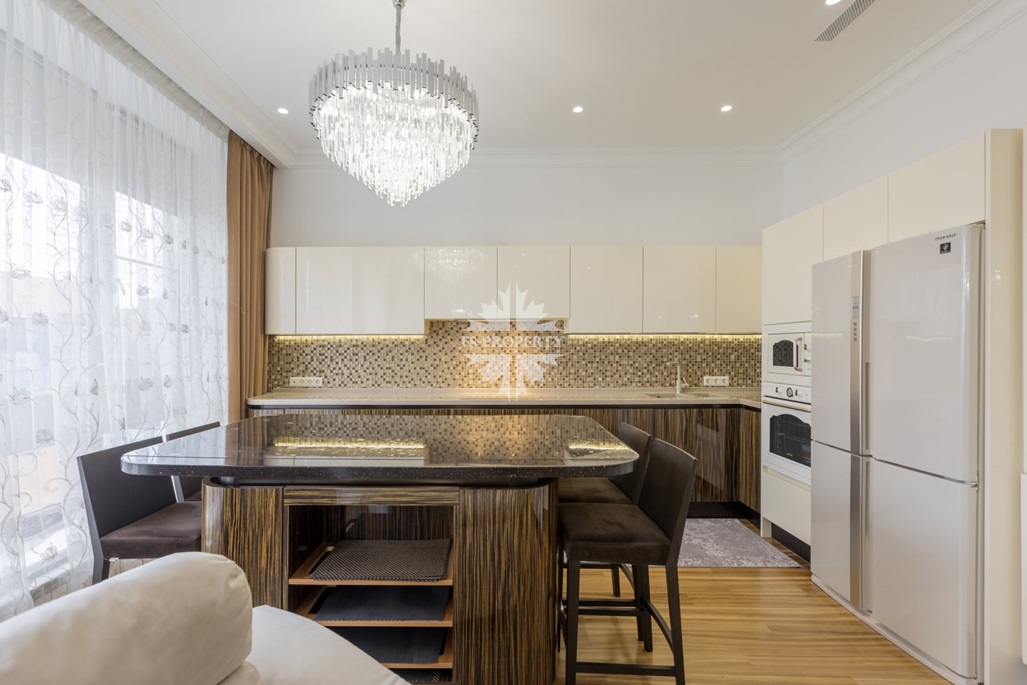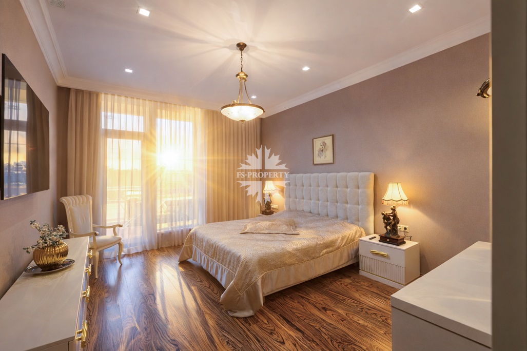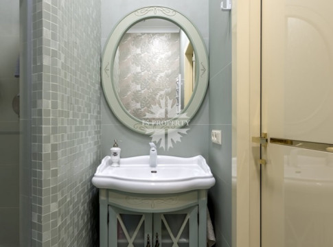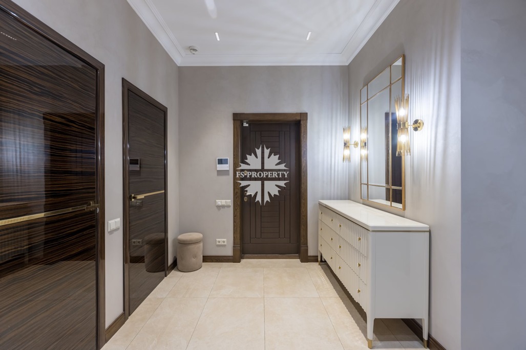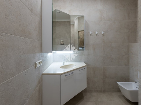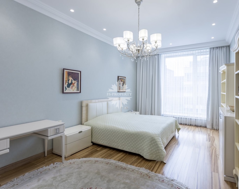 Квартира укомплектована мебелью и бытовой техникой известных мировых производителей. В отделке использованы высококачественные материалы: дуб, мрамор, травертин.