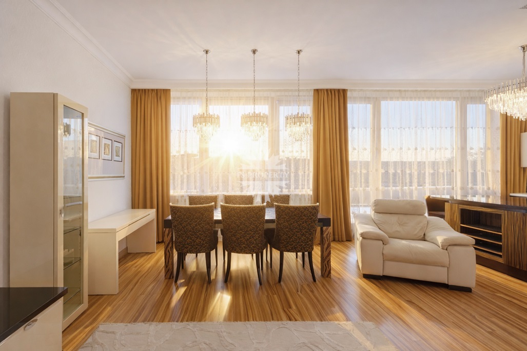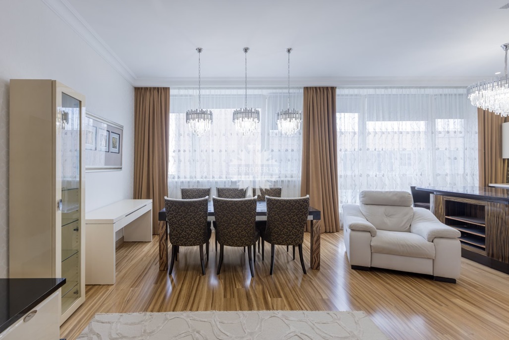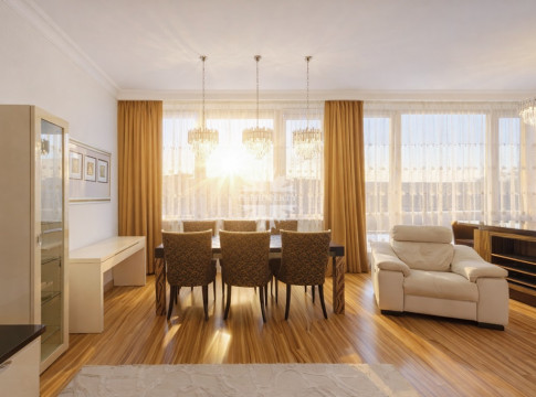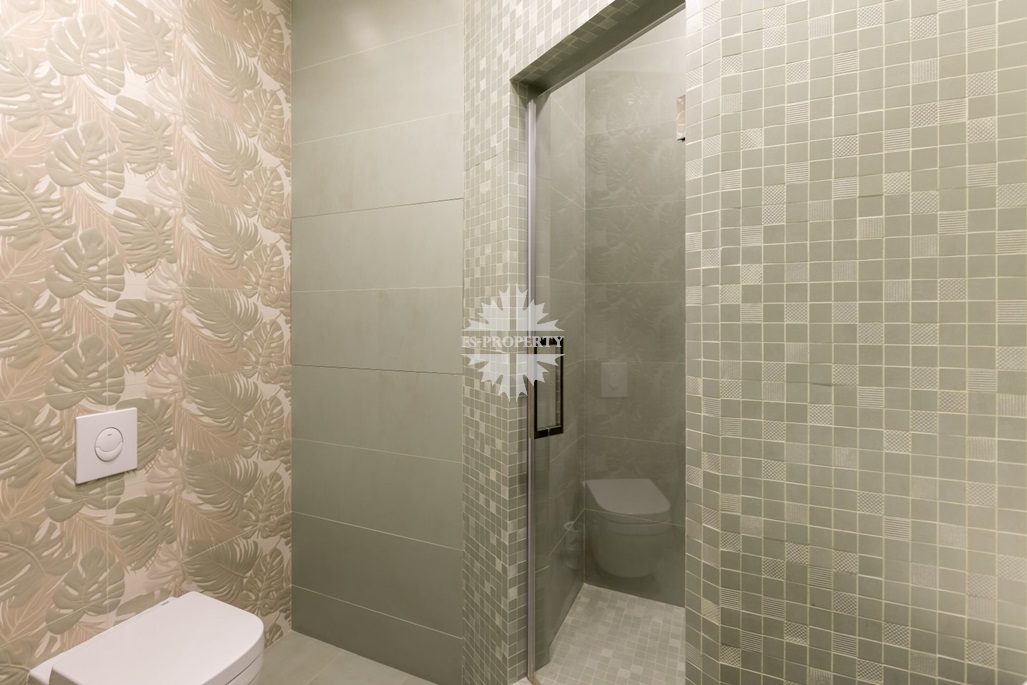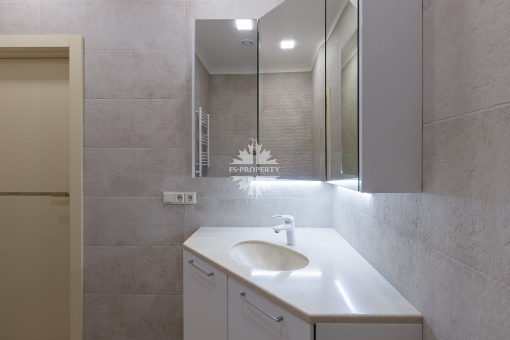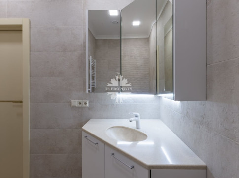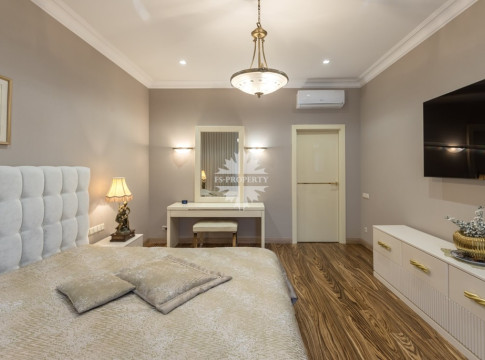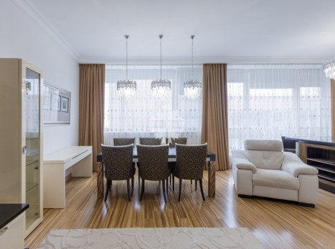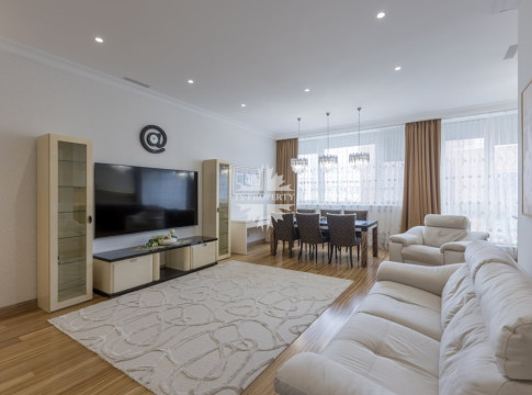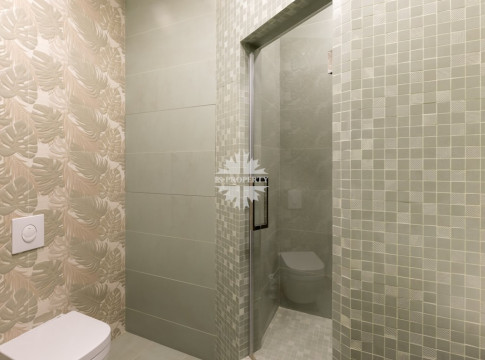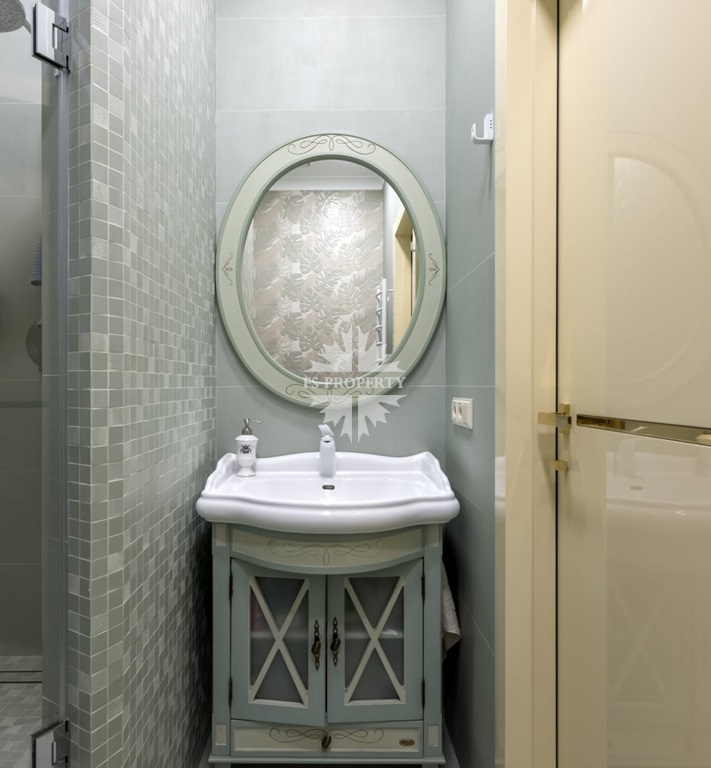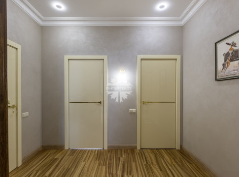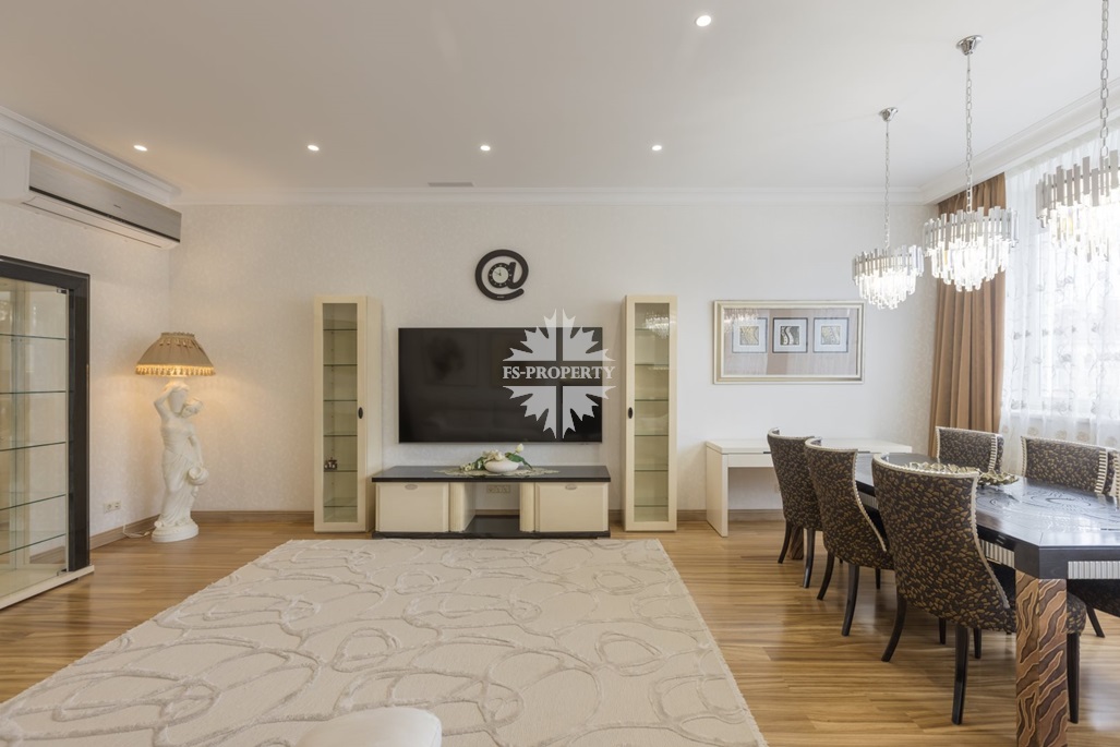 Квартира укомплектована мебелью и бытовой техникой известных мировых производителей. В отделке использованы высококачественные материалы: дуб, мрамор, травертин.