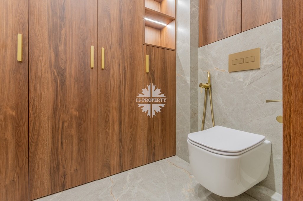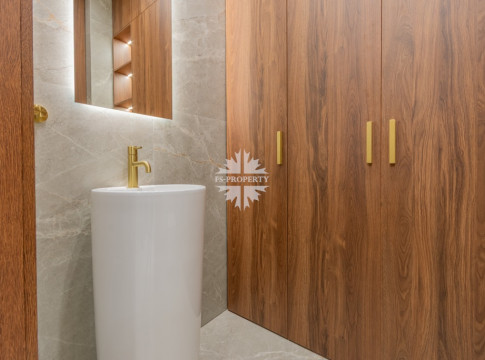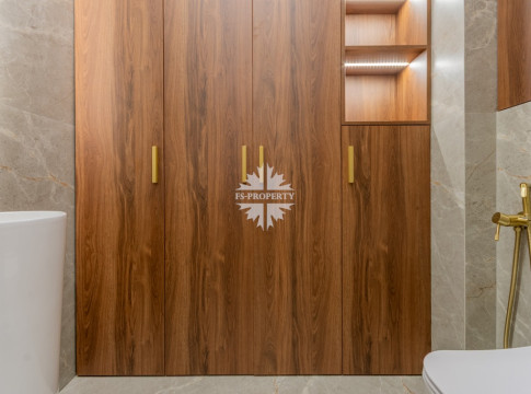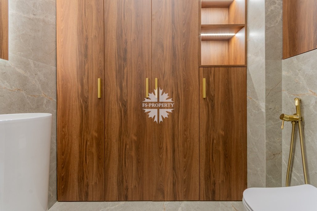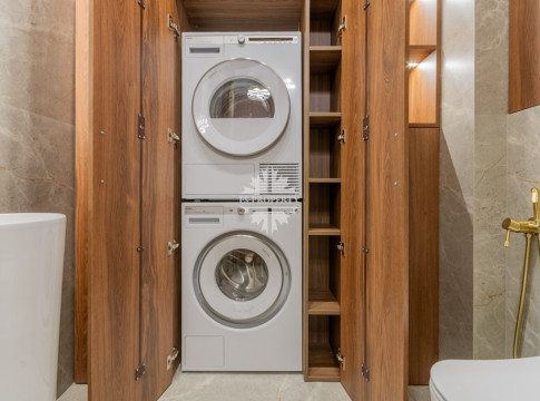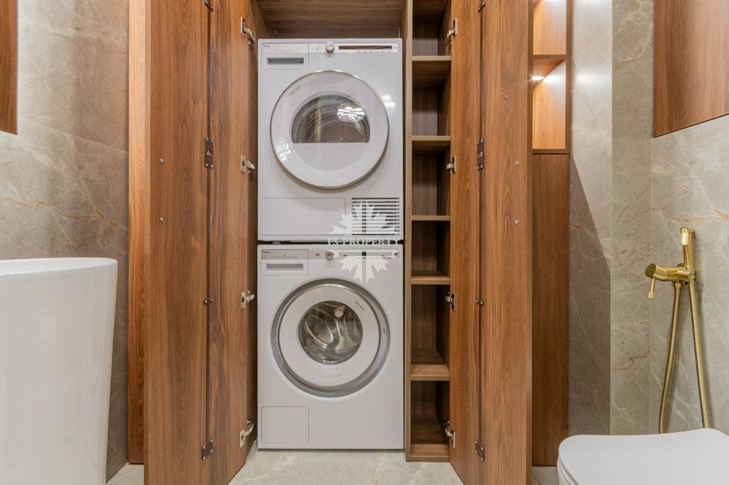 Прихожая с вместительными встроенными шкафами; в гостевом санузле — встроенный шкаф для хозяйственных принадлежностей; стиральная и сушильная машина встроены.