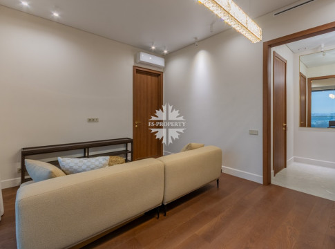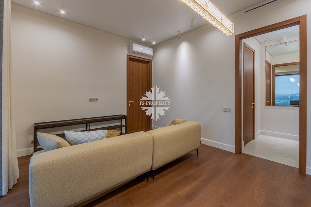 Кухня‑гостиная полностью меблирована и оснащена техникой премиум‑класса; из гостиной — выход на лоджию с видом на город и набережную.