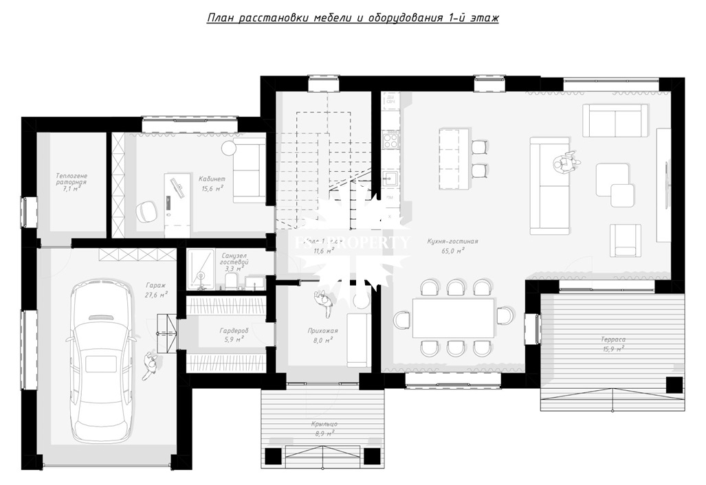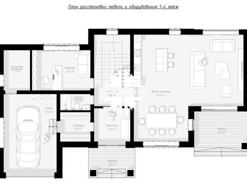 1 этаж: кухня столовая 65 м2 с панорамным остеклением, жилая комната 15 м2 (спальня/кабинет), гостевой санузел, гараж и проходная гардеробная при входе, терраса выходит на солнечную сторону участка.