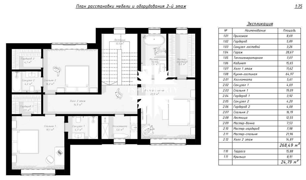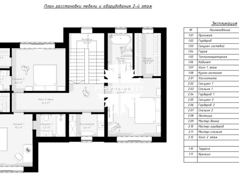2 этаж: 3 просторные спальни, каждая из которых имеет свою гардеробную и санузел, отдельная комната в качестве домашней постирочной.