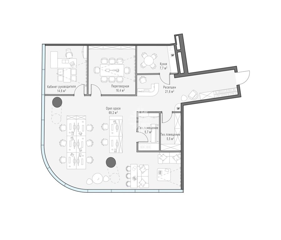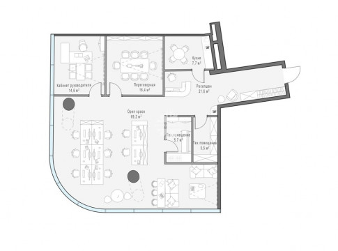 Свободная планировка и минимальное количество несущих конструкций позволяют максимально эффективно зонировать пространство. Панорамное остекление обеспечивает максимальное количество естественного освещения в дневное время и динамичный вид на город в вечернее. Наличие мокрой точки позволяет организовать в офисе кухню или дополнительные санузлы.