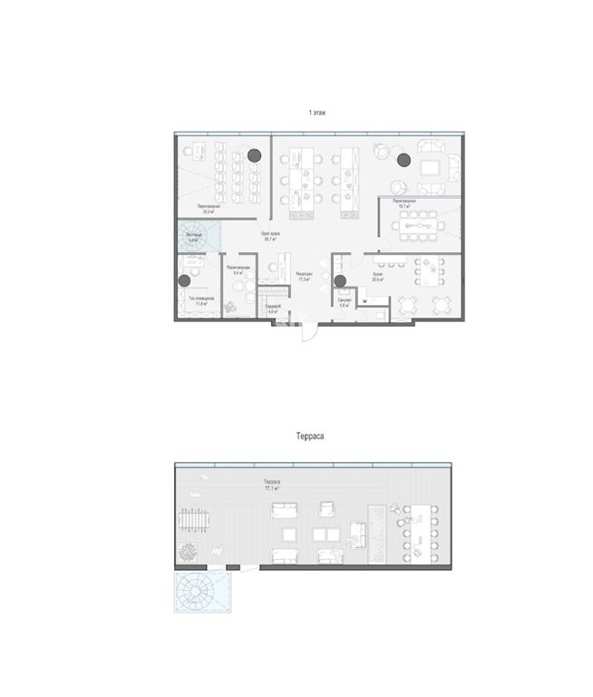 остекление обеспечивает яркое естественное освещение в дневное время и динамичный вид на город в вечернее. Наличие мокрой точки даёт возможность обустроить в офисе кухню или дополнительные санузлы, а собственную террасу можно использовать в качестве воркаут-зоны или пространства для работы и отдыха на открытом воздухе.