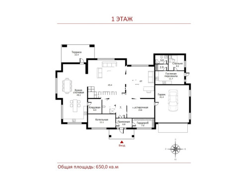 1 этаж: гардеробная, с/у, каминный зал со вторым светом, кухня-столовая с выходом на просторную террасу, спальня (кабинет), котельная, постирочная, кладовая, квартира для персонала с отдельным входом, гараж на 2 м/м, навес на 2 м/м.