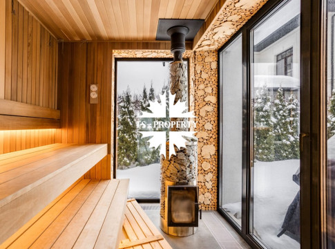 В гостевом двухэтажном доме площадью 175,4 м2 располагается спа-зона с бассейном и сауной, кабинет, 2 спальни, 2 санузла и закрытая терраса - зона отдыха.