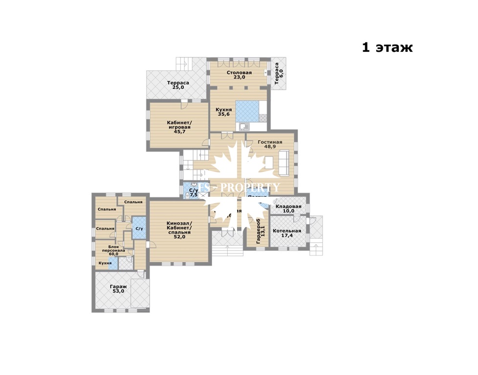 1 этаж: cтоловая с электрокамином, кухня, гостиная с дровяным камином, кинозал / кабинет / спальня, кабинет или игровая комната, гардероб, блок для персонала, кладовая, постирочная, котельная, две террасы, санузел, гараж;