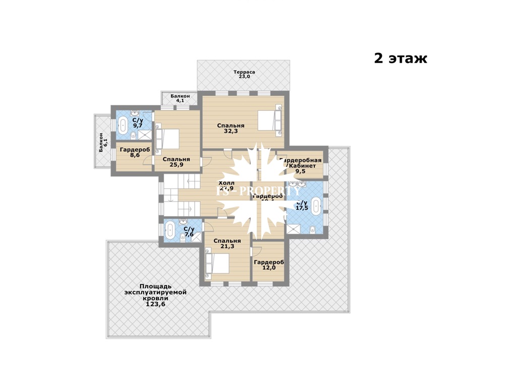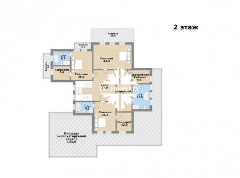 2 этаж: спальня 1 с кабинетом, гардеробной, ванной и выходом на террасу, спальня 2 с балконом, гардеробной и ванной комнатами, спальня 3 с ванной и гардеробной, просторный холл, выходы на эксплуатируемую кровлю площадью 123,6 кв.м.