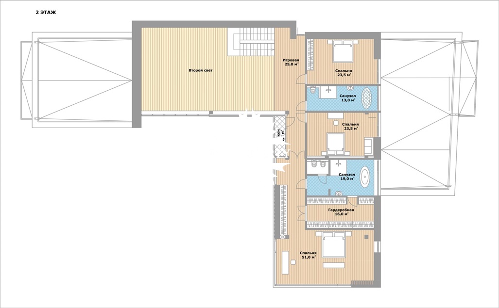 2 этаж: мастер-спальня с гардеробной и ванной комнатой, две детские, общий с/у, игровая, балкон.
