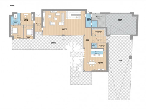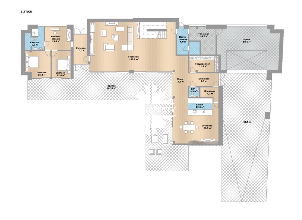 1 этаж: гостиная со вторым светом и выходом на террасу, объединенная кухня-столовая, кладовая для продуктов, гостевой блок из 2-х спален с комнатой отдыха и ванной, прихожая с гардеробной, общий с/у, постирочная, гараж на 2 м/м, топочная, холл;