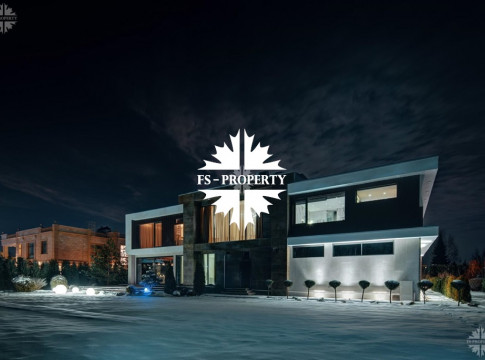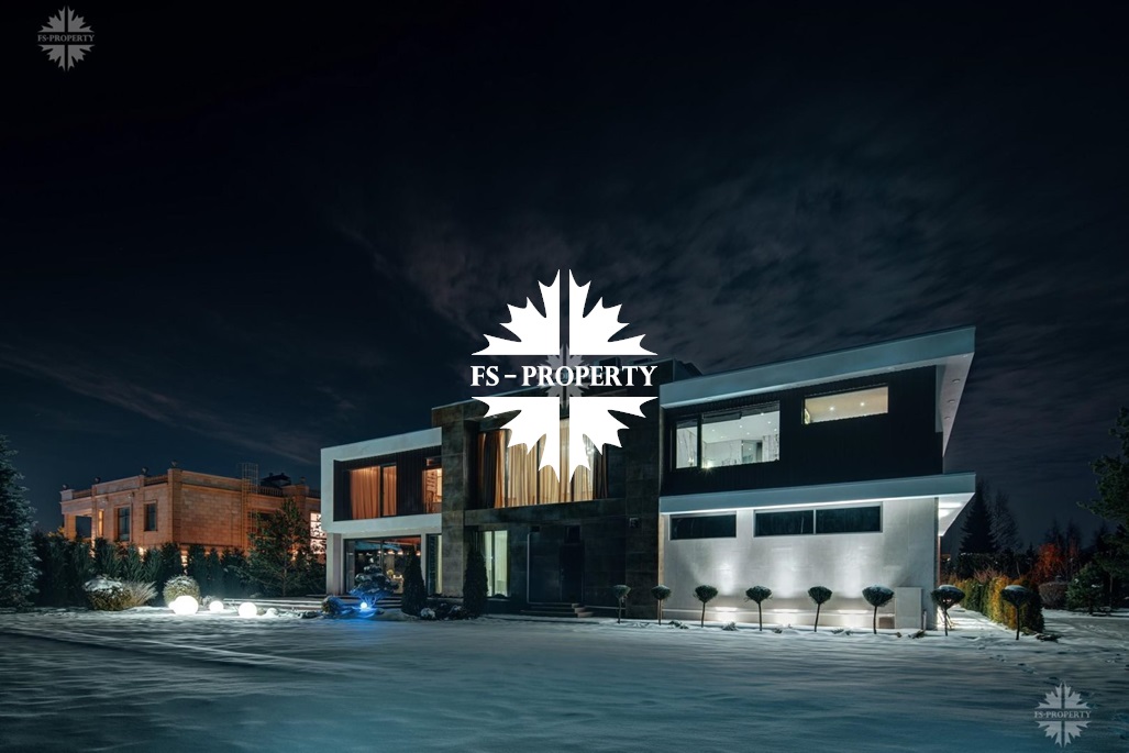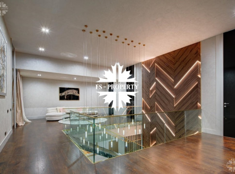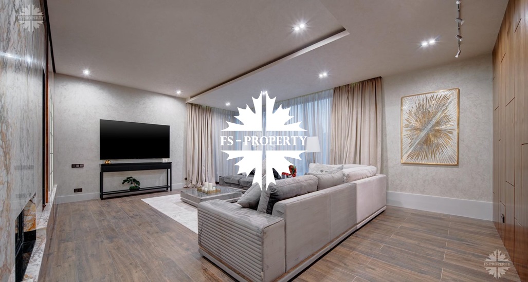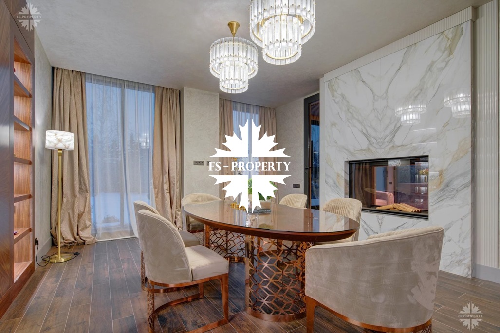В доме 5 спален, 6 санузлов, кухня-столовая, гостиная с камином, кабинет, гардеробные, зона СПА.