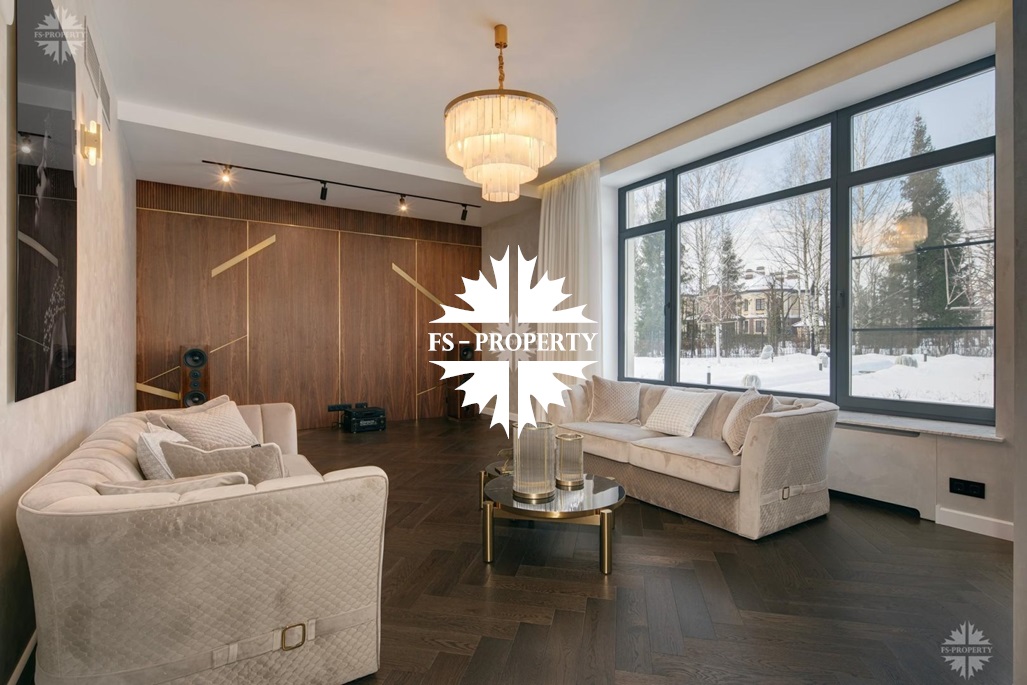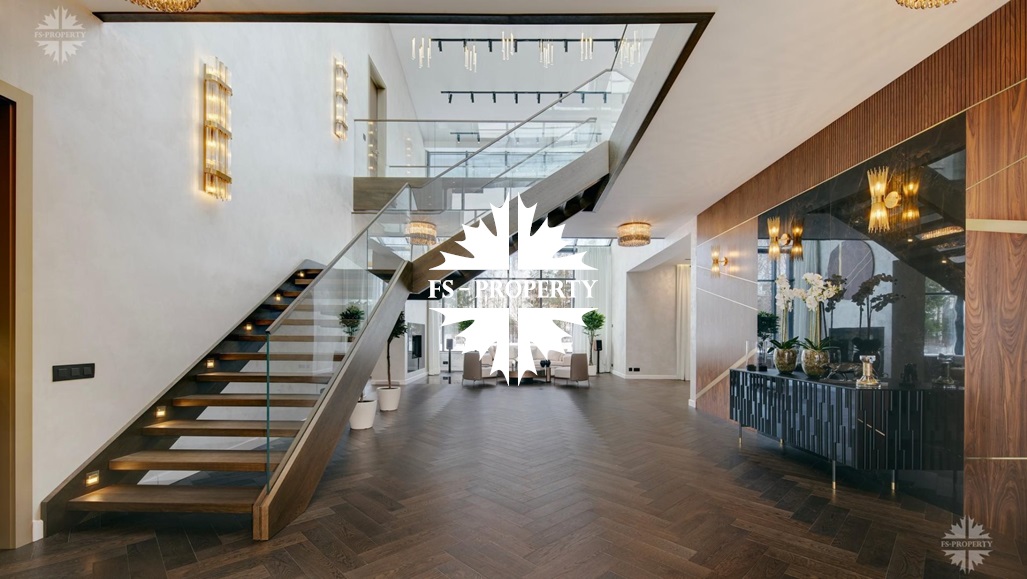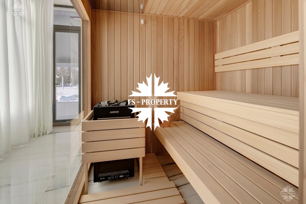 1 этаж: прихожая, гардеробная, гостевой санузел, гостиная с двусторонним камином, кухня-столовая (с кладовкой), гостевая спальня с санузлом, SPA-зона c сауной, тренажерным залом, зоной отдыха с выходом на террасу, бойлерная, постирочная, гараж на 2 м/м;