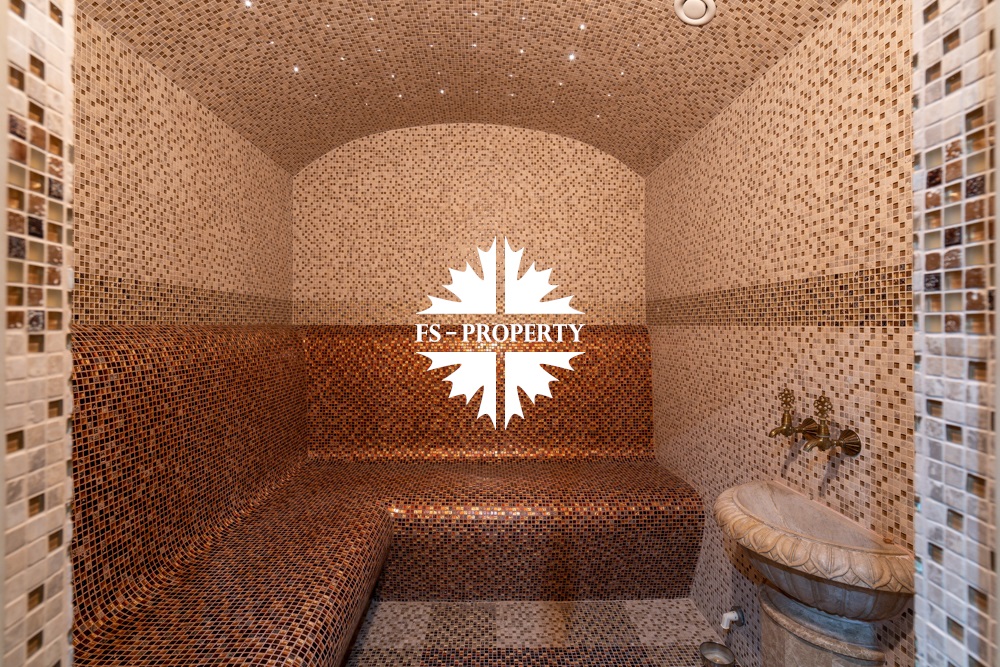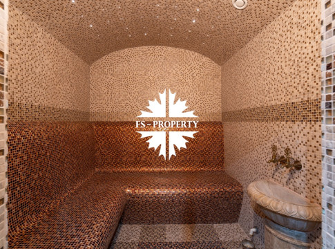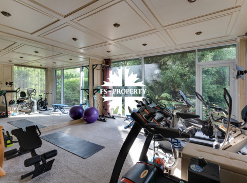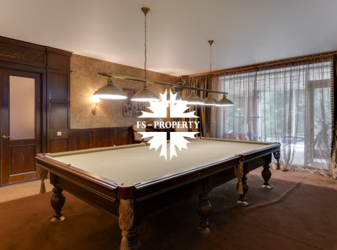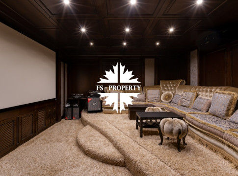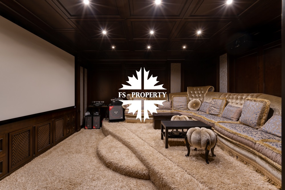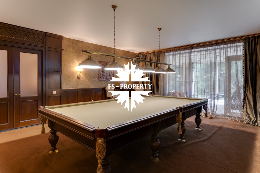 Цокольный этаж: прихожая, кинотеатр, санузел, хамам, баня, джакузи, раздевалка, холодильник для хранения шуб, чемоданная, бильярдная, спортзал с видом и выходом на участок, кабинет, техническая кухня.