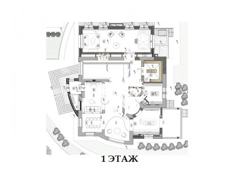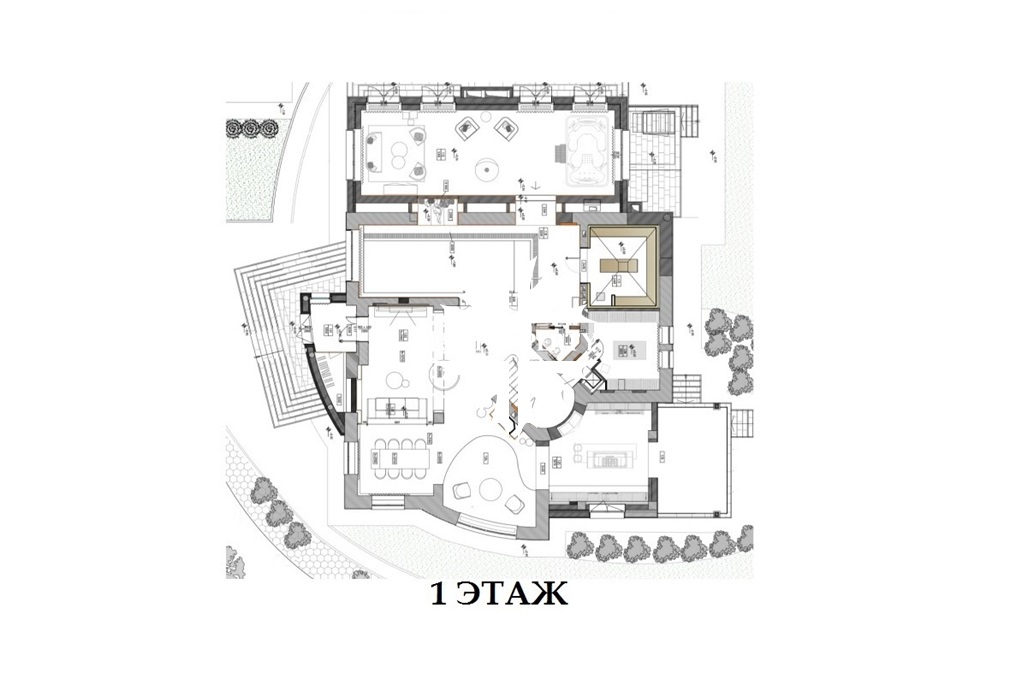 Первый этаж имеет чёткое деление на парадные и общественные зоны, где располагаются прихожая с гардеробной, холл, гостиная, кухня и столовая, и частное пространство с зоной отдыха и бассейном.