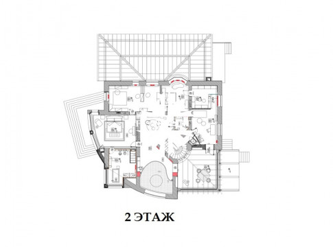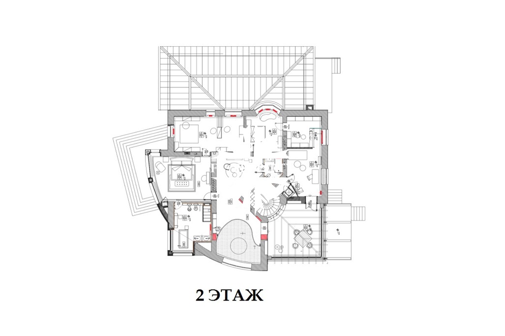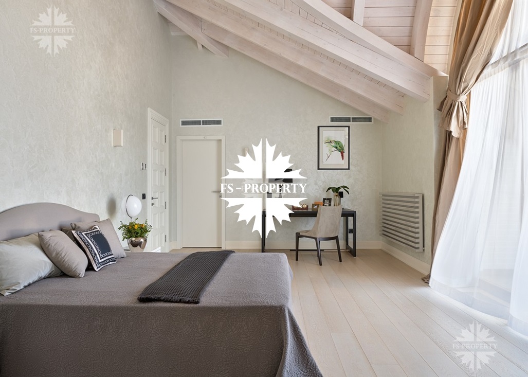 На втором этаже спальня владельцев дома с основной ванной комнатой и большой гардеробной, детская комната со спальней и отдельной игровой зоной, а также веранда.