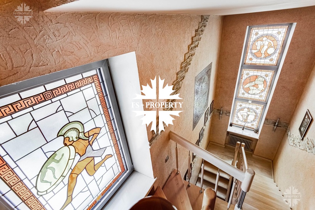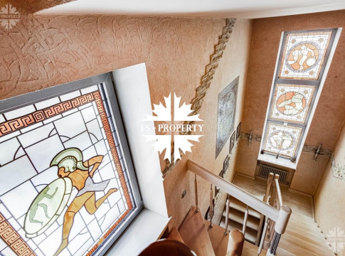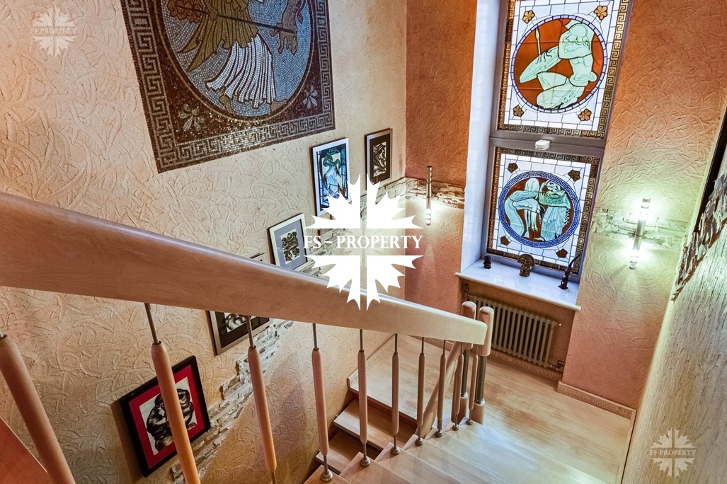 В интерьере дома использованы 5 панно из римской натуральной мозаики итальянской фирмы Bisazza с сюжетами из мифологии древней Греции и витражи оконные, произведенные на заказ у известного литовского мастера. Также витражи того же мастера использованы в потолочном освещении некоторых помещений (гостиная, кухня, СУ 2го этажа). Санузлы отделаны плиткой и оборудованы сантехническими предметами компании Villeroy & Boch.