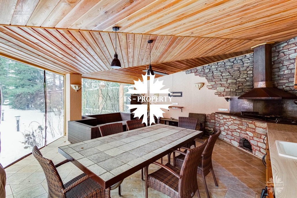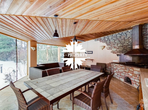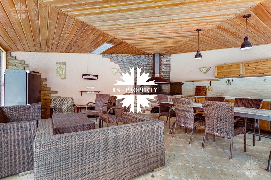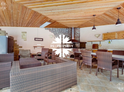 Летняя беседка из кирпича и натуральной черепицы площадью 36 м кв имеет зону барбекю и медную вытяжку. К строению подведены все коммуникации. За беседкой имеется подсобное помещение для хранения инвентаря, закрывающееся автоматическими жалюзи. Для гостей в летний период предусмотрен отдельный СУ, расположенный рядом в другой отапливаемой постройке, используемой для хранения.