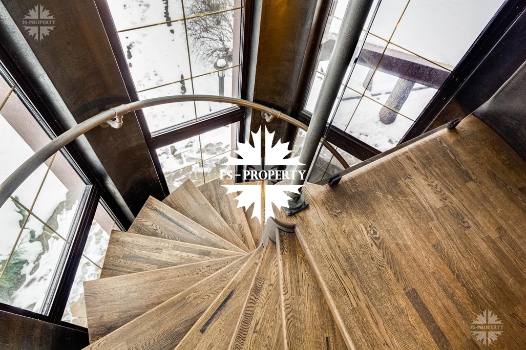Первый этаж имеет большую зону гостиной (47 м кв) с камином из мрамора, кухню (22,5 м кв), прихожую и СУ. Пол отделан натуральной массивной доской шведской фирмы Junckers из красного дерева. Лестница межэтажная выполнена из массива клена, конструкция «консольная», что придает ей легкость, воздушность.