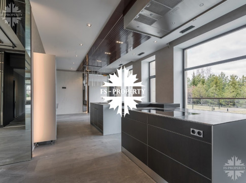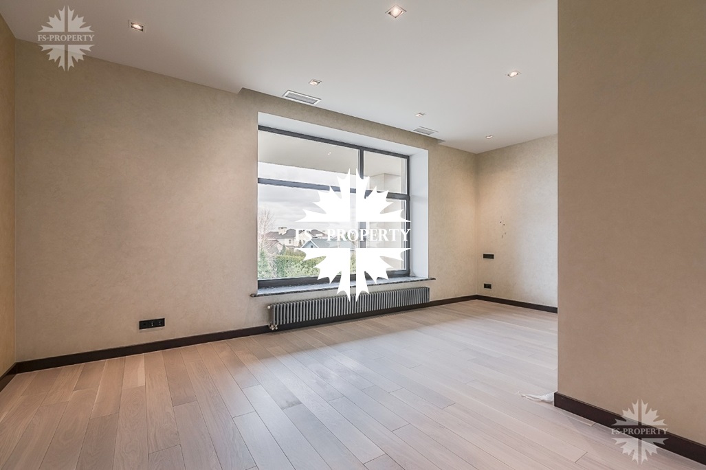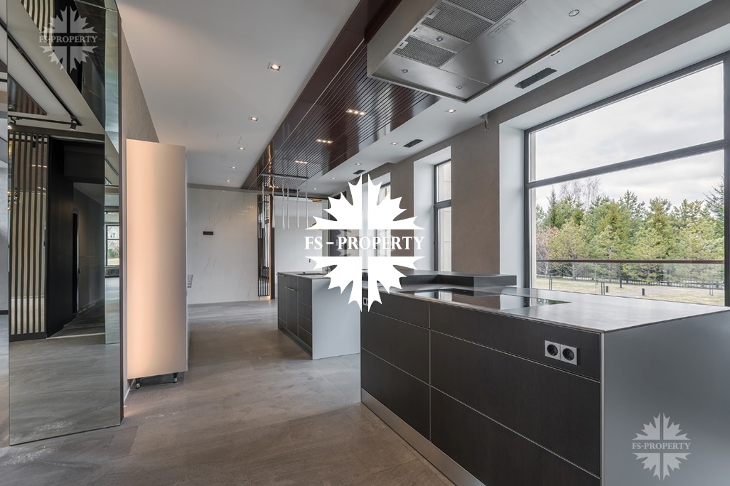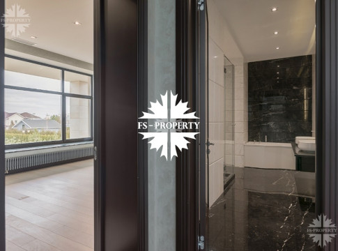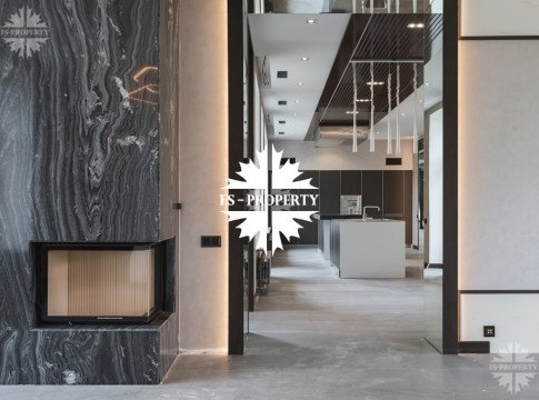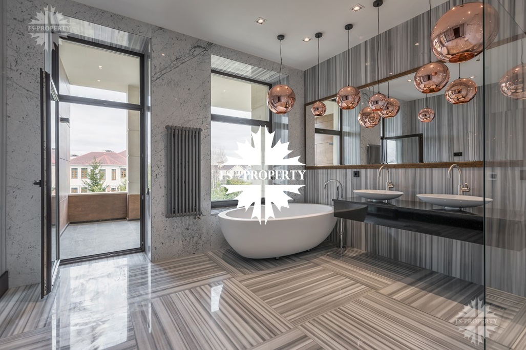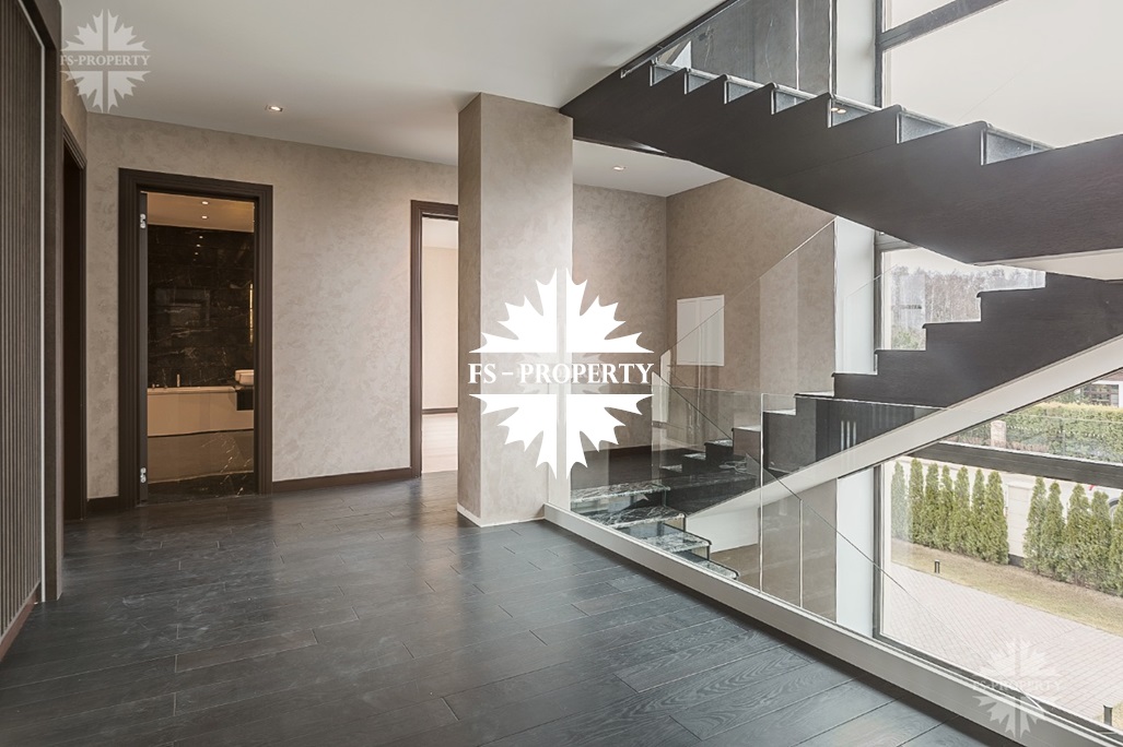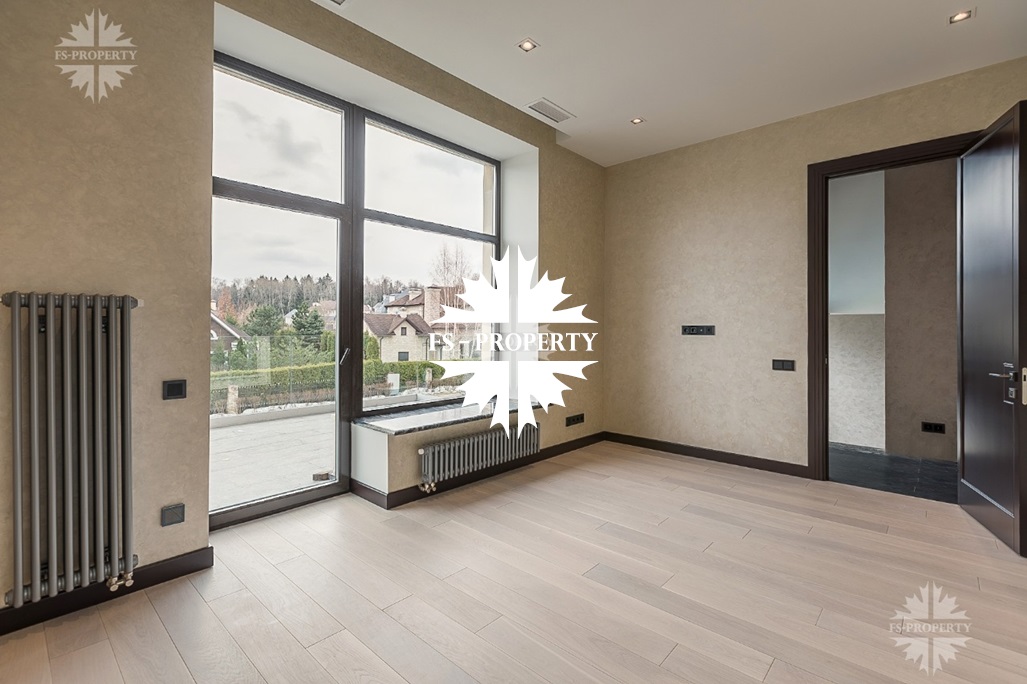 В доме – просторный холл, гостиная с камином, кухня, столовая, пять спален, четыре из них – с отдельными санузлами, терраса, гараж. Кухня bulthaup оборудована бытовой техникой Gaggenau, в ванных комнатах установлены ванны Teuco, смесители – Dornbracht. После завершения внутренней отделки в доме никто не жил.
