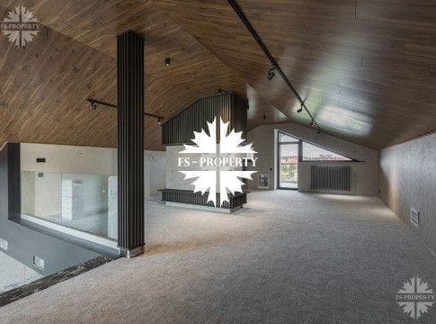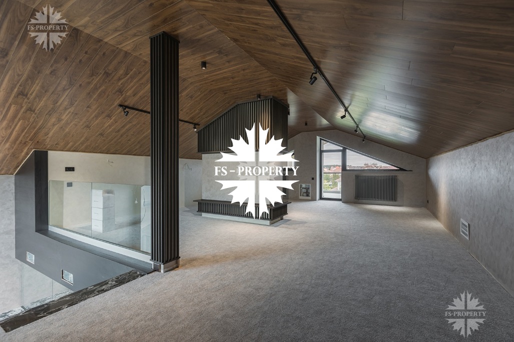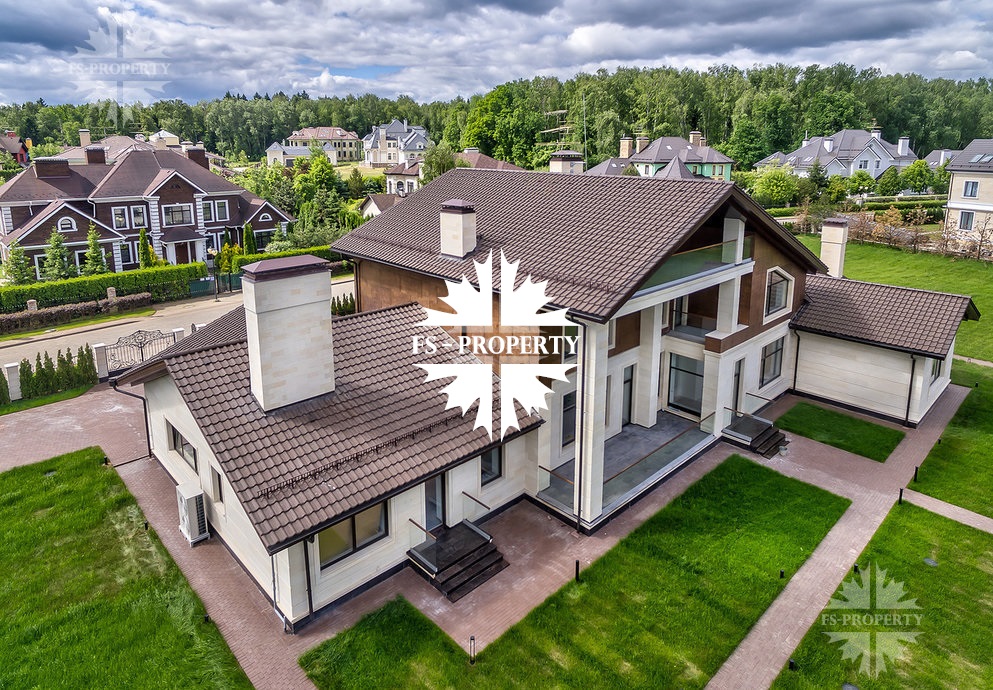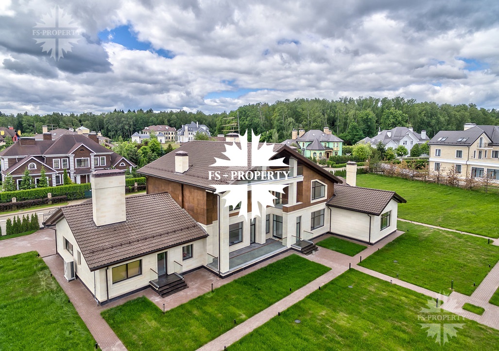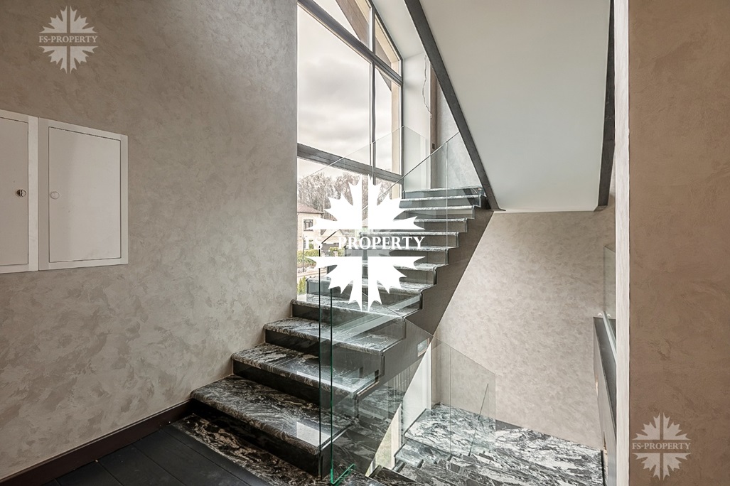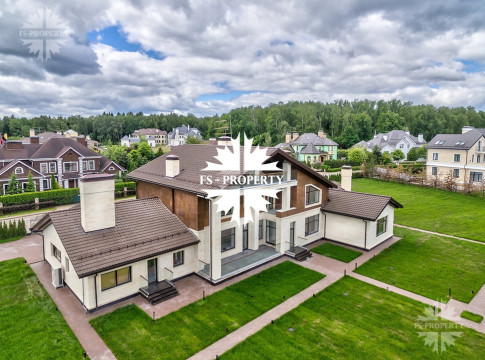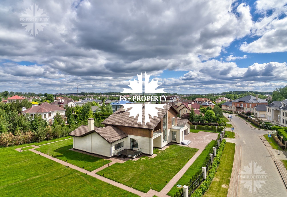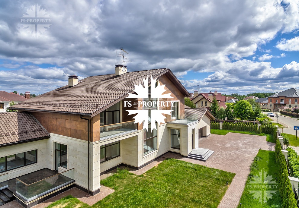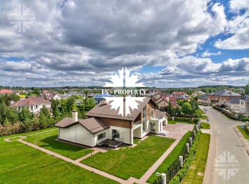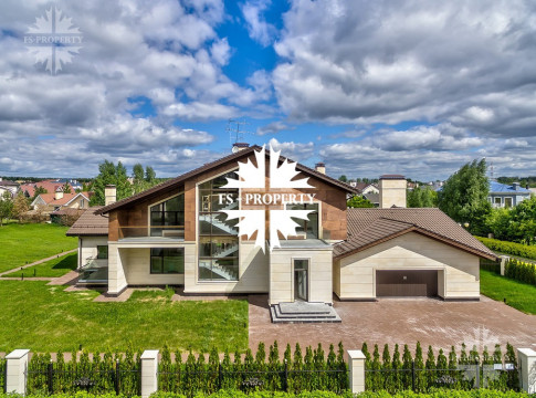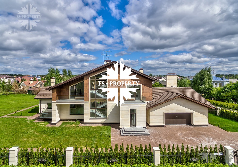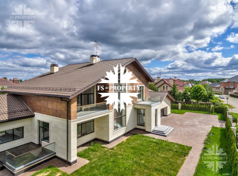 Двухэтажный коттедж с мансардой построен из кирпича, в стиле альпийского шале. Фасад с большими панорамными окнами из красного дерева, отделан деревом и натуральным камнем, на скатной крыше уложена керамическая черепица.