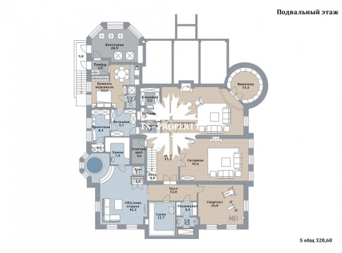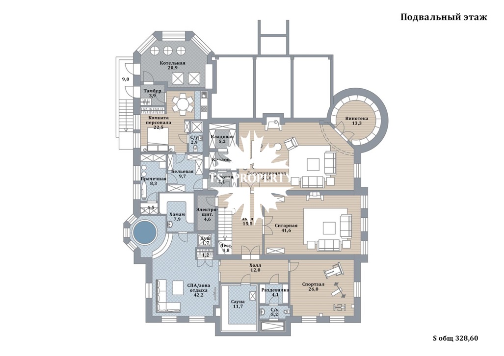 Цокольный этаж: холл, сауна, СПА, хамам, спортзал, раздевалка, санузел, сигарная, дегустационная комната, винотека, комната для персонала, санузел, тумбур, котельная, прачечная, бельевая, электрощитовая, 3 кладовые комнаты.