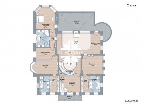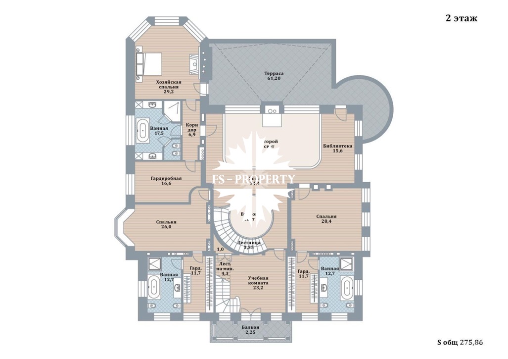 2 этаж: мастер-спальня с собственной ванной комнатой и гардеробной, просторный холл со вторым светом, 2 гостевые спальни с собственными санузлами и гардеробными, учебная комната с выходом на балкон, библиотека.